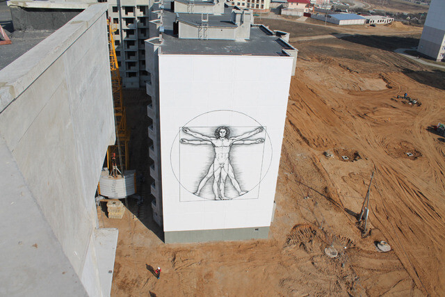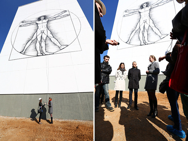 Журналистов встречает 12-метровый витрувианский человек, изображение которого нанесено на одну из стен жилого дома. Двое суток кропотливой работы молодых художников из группы Art&Shock и 20 баллончиков краски позволили создать необычное произведение искусства на фасаде новостройки и по совместительству самого большого витрувианца в Европе.