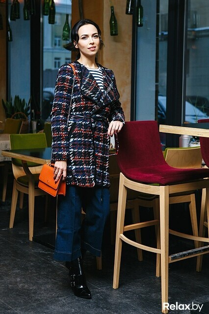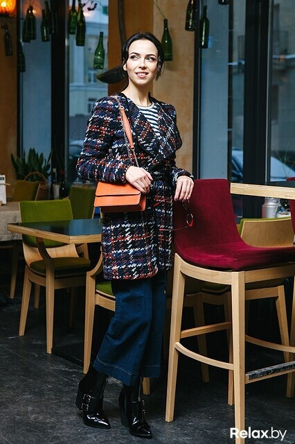 — На Татьяне удобные джинсы-кюлоты со стрелками, наверняка самый элегантный вариант джинсов в принципе, — комментирует стилист. — Дополнены они уютным кардиганом в клетку (тонким пальто) и контрастной футболкой в горизонтальную полоску: такой принт всегда добавляет образу динамики. Композиционный центр образа — компактная сумка на цепочке апельсинового оттенка. В качестве обуви предложены ботильоны, моделью напоминающие «казаки», актуальные уже не первый сезон. Их острый мысок и глянцевая фактура добавляют образу Тани пикантности, особенно вместе с имиджевыми очками.