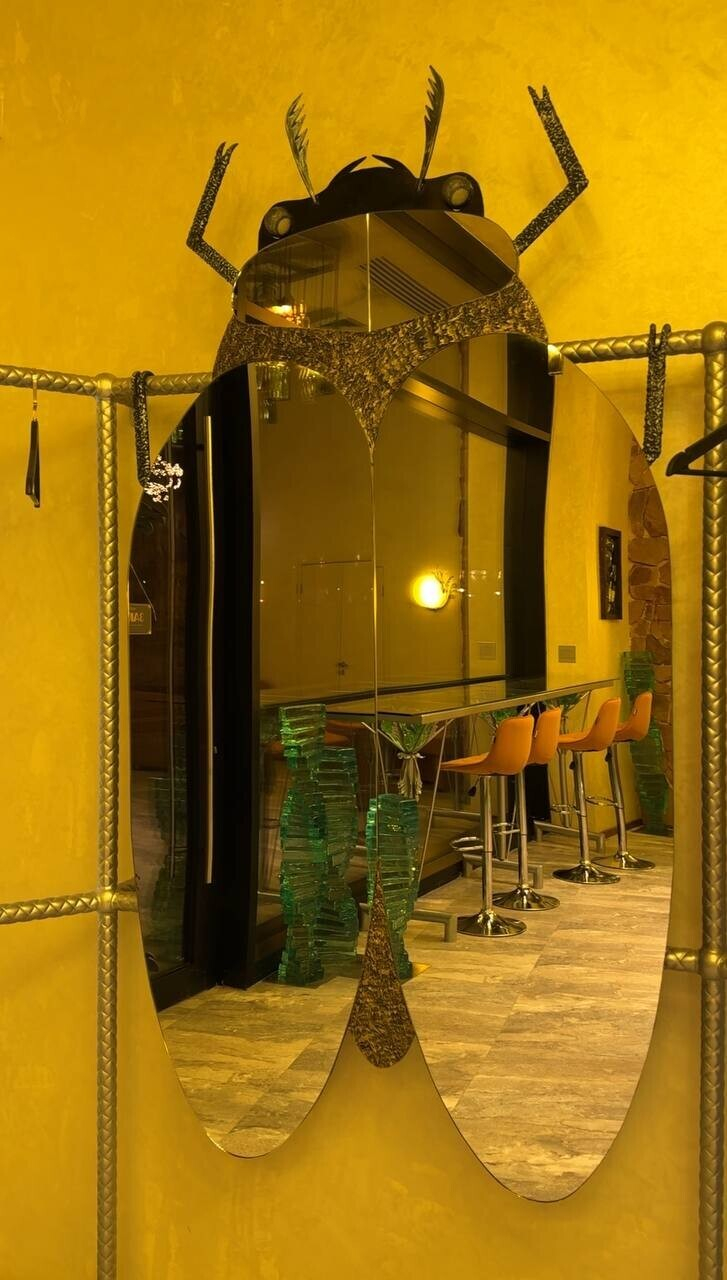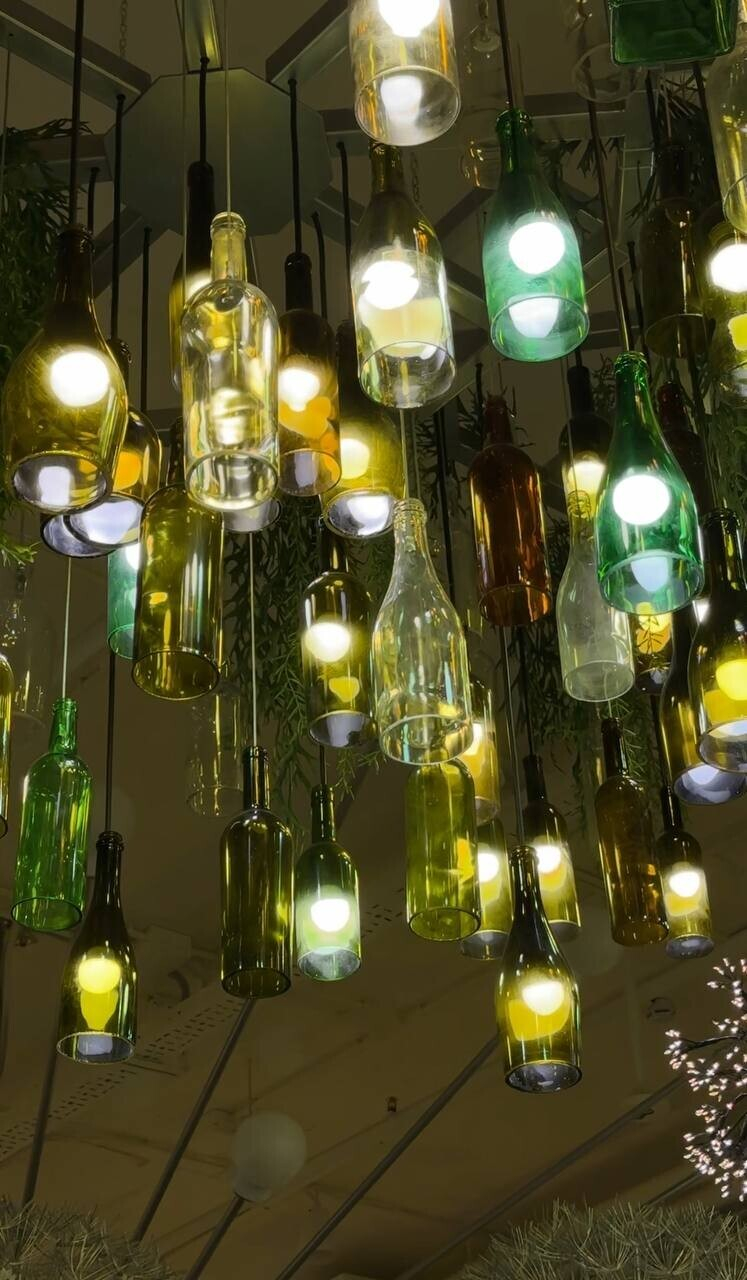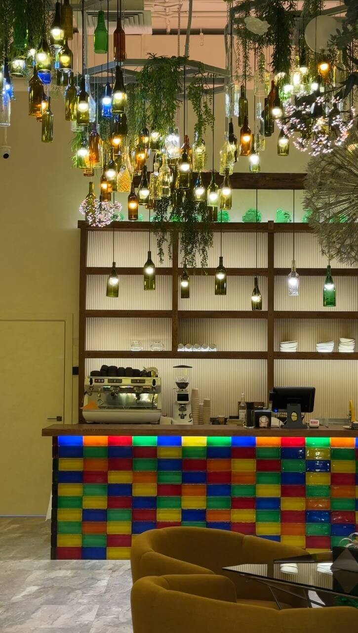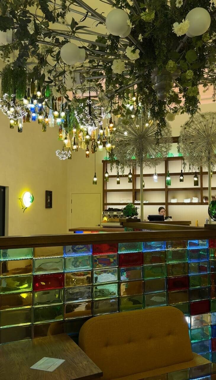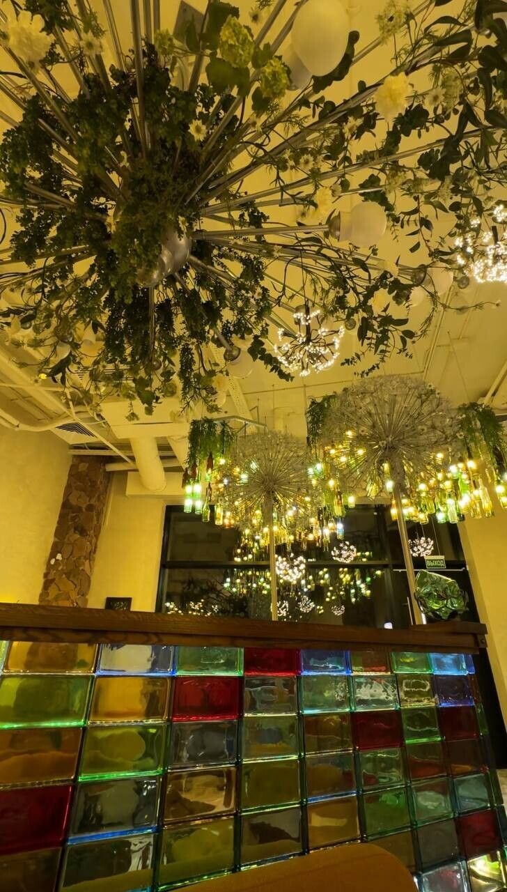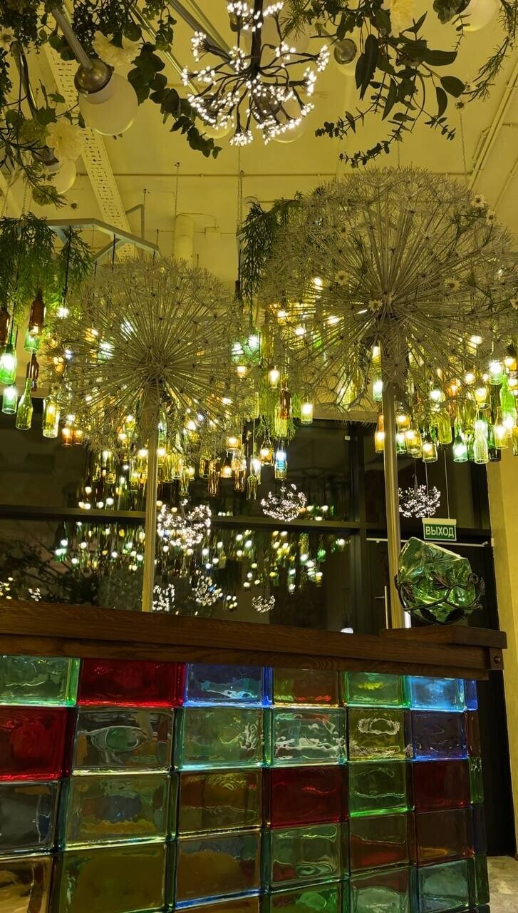 Пока ждете свой заказ, поднимайте голову вверх — там очень интересно. Светильники в виде бутылок, насекомых... И все это на разных уровнях (благо, высота потолков в здании позволяет). Но самый эффект арт-объекти в Gorky Park — гигантские одуванчики. Полагаем, что это тоже светильники, но при нашем посещении их не включали. Бонусом — зеркало в виде жука для селфи.