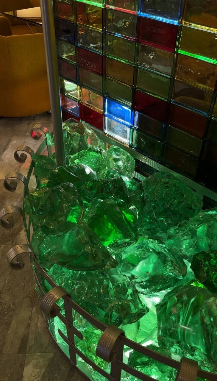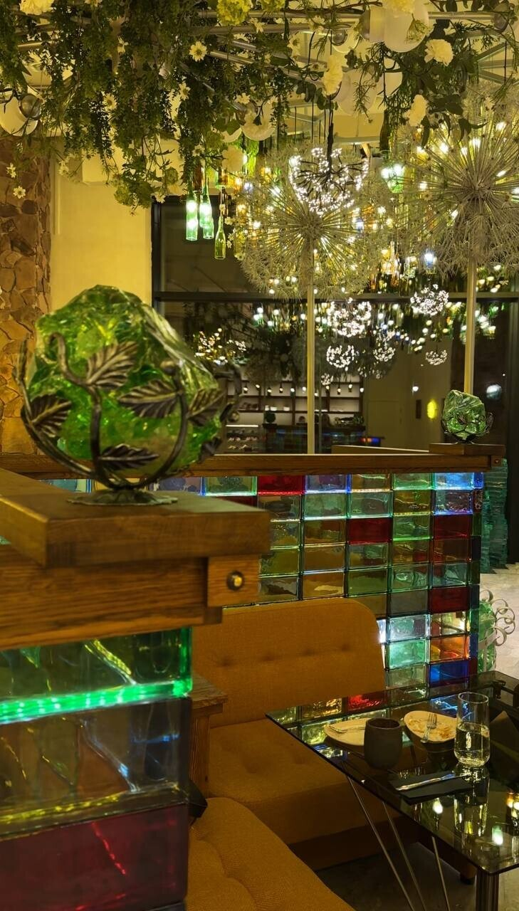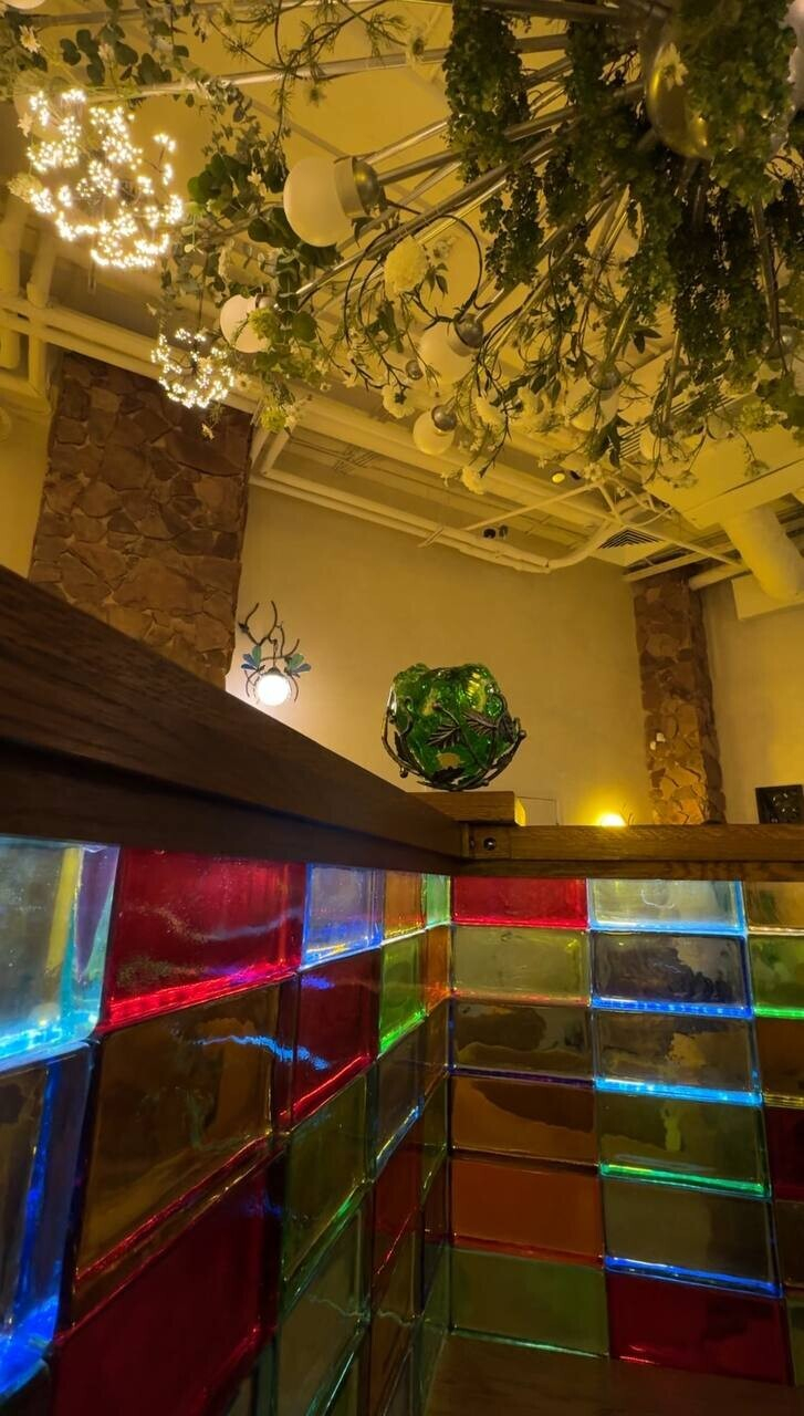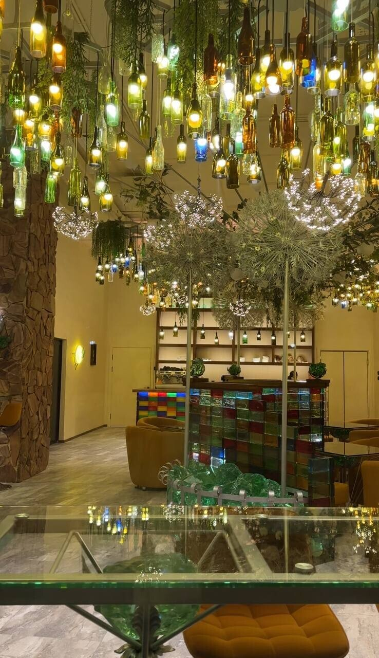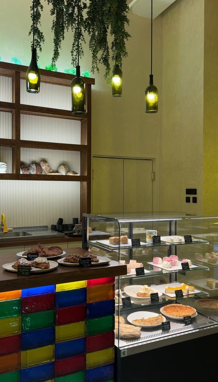 Итак, знакомимся с Gorky Park (Горький парк) — это кафе-пекарня с интерьером, который обескураживает с порога. Как и в случае с рестораном по соседству, как будто попадаешь в другое измерение. Только не таинственно космическое, а красочно загадочное. Знакомый штрих — имитация зеленых минералов, которыми щедро украшены некоторые зоны заведения.