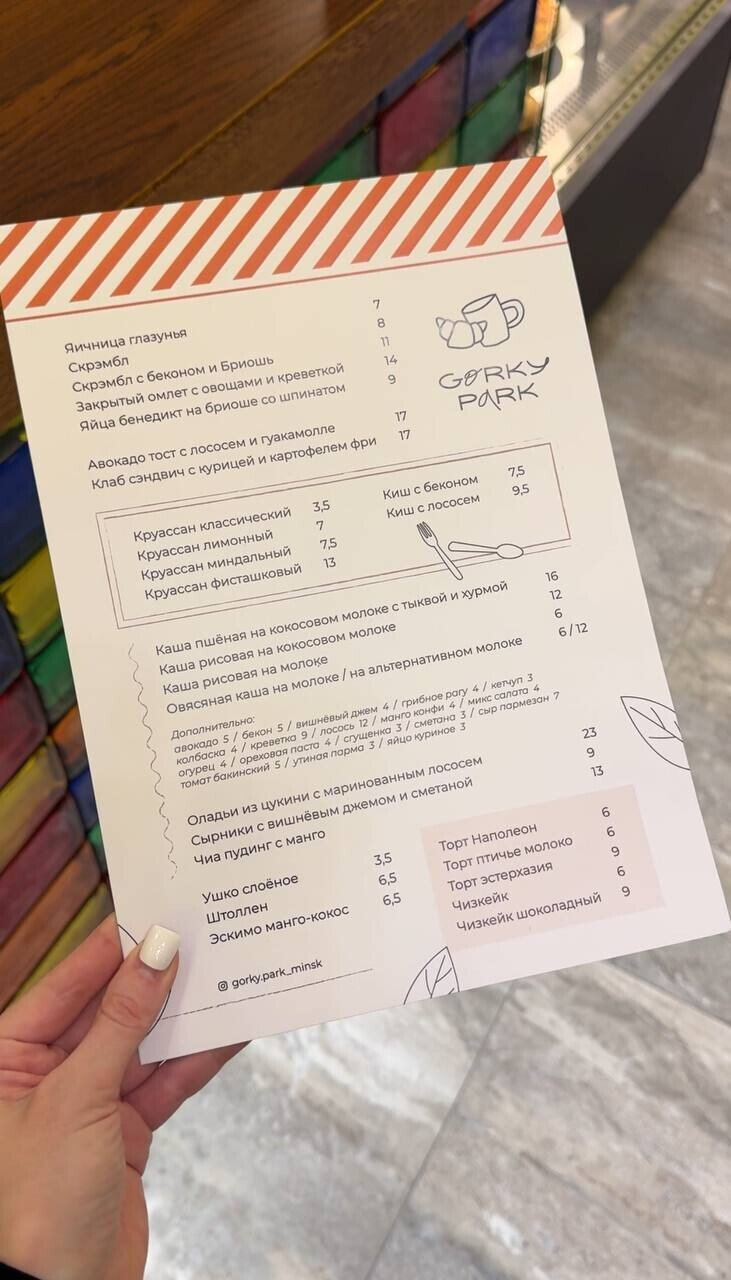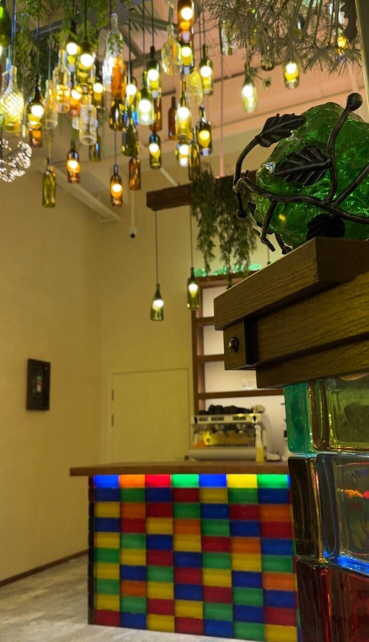 Зал достаточно просторный, посадка точно 20 плюс гостей. Отдельное спасибо дизайнерам за эффектную перегородку из цветных стекол — это и красиво, и практично. Возле столиков есть удобные розетки с разными разъемами, а эстеты точно оценят стол у панорамного окна с видом на Свислочь и парк Горького.
