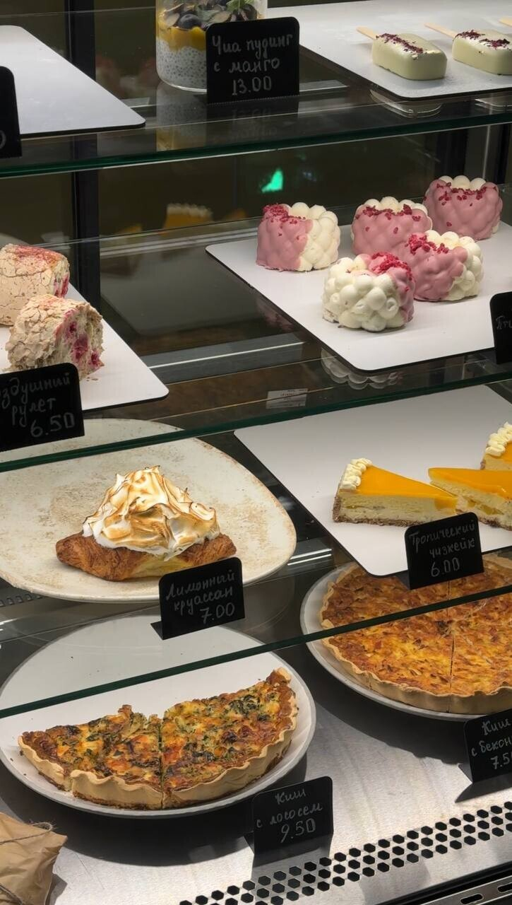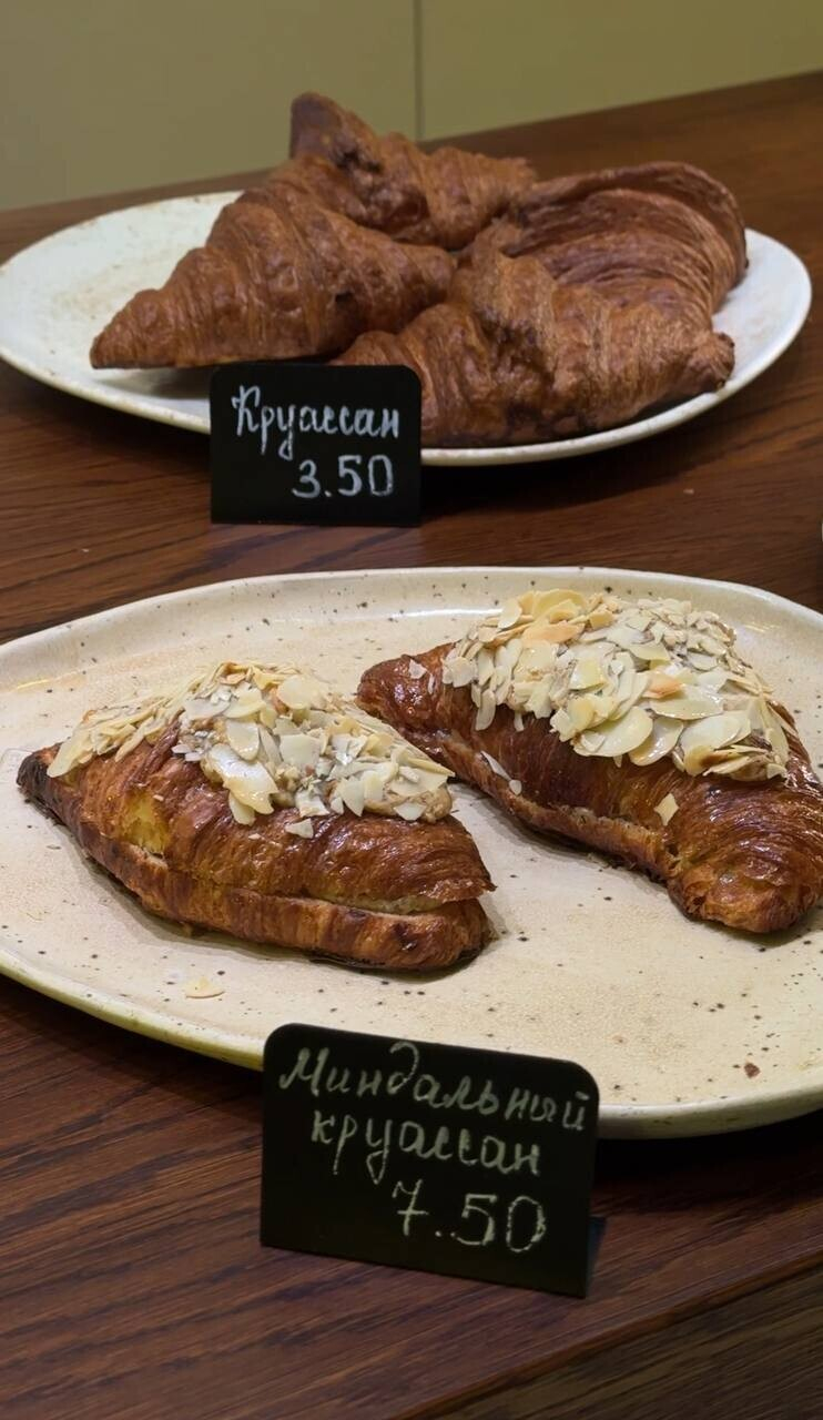 Заведение в глубоком тестовом режиме, но витрина заполнена неплохо. Цены мы бы назвали приятными: классический круассан — 3,5 руб., миндальный круссан — 7,5 руб., лимонный круассан — 7 руб., киш с беконом — 7,5 руб., киш с лососем — 9,5 руб. Десерты стоят не дороже 9 руб.: «Наполеон» — 6 руб., «Птичье молоко» — 6 руб., «Чизкейк» — 6 руб., «Шоколадный чизкейк» — 9 руб.