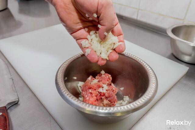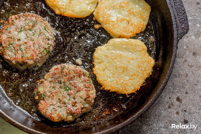 Как подчеркивает шеф-повар, главное в этом блюде — сделать правильные драники и котлеты. Для сочности последних Александр добавляет немного сала.