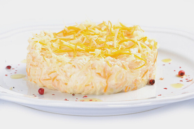 Этот вариант салата по вкусу чуть более свежий и пикантный. Готовится быстро и со стола разлетается не хуже классического.
