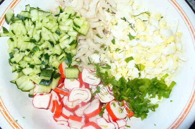 04 Все продукты тщательно смешиваются и заправляются майонезом. Не забываем про лук и укроп, которые предварительно промываются и мелко нарезаются. Добавляем соль по вкусу. Салат подается исключительно охлажденным, поэтому перед подачей оставляем его на минут тридцать в холодильнике.