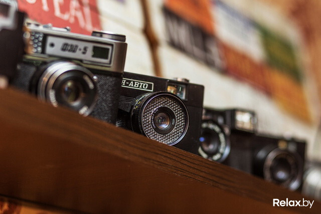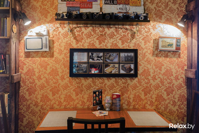 Приятно, что интерьер в залах разнится. Первый — помещение с более интимным освещением в стиле маленького английского бара 1960-х. И декорации соответствующие: полка со старинными фотоаппаратами, многочисленные handmade-вещицы (которые, кстати, приносят сюда сами гости), мебель под старину и вызывающие улыбку английские надписи на стенах и барной стойке в стиле «Любовь — это все, что тебе нужно».