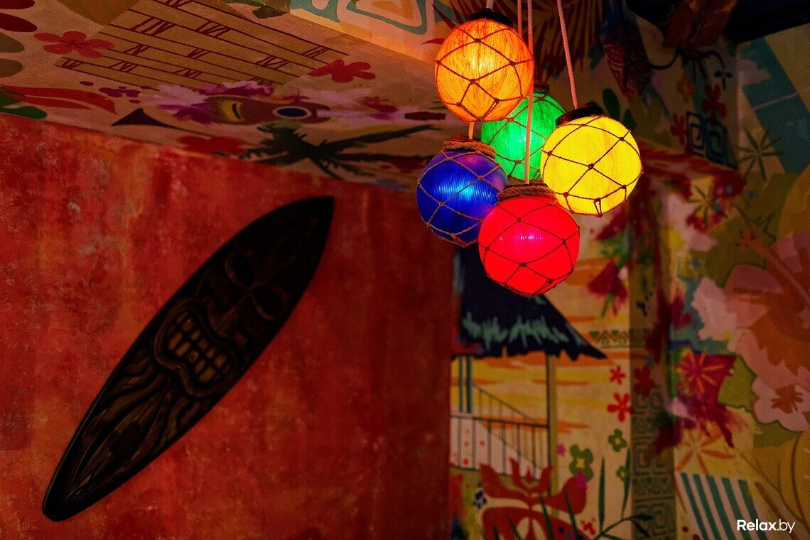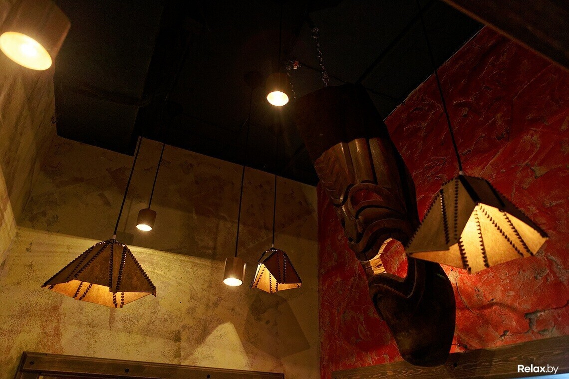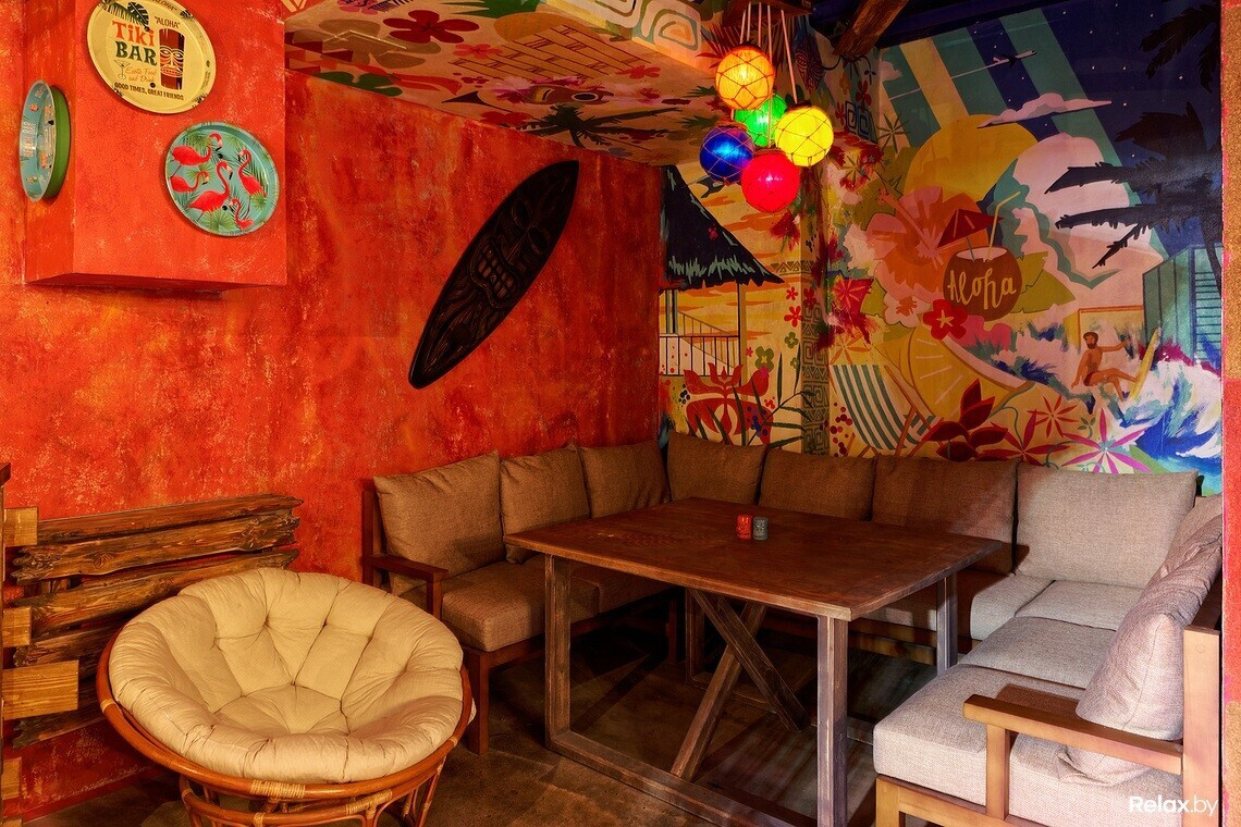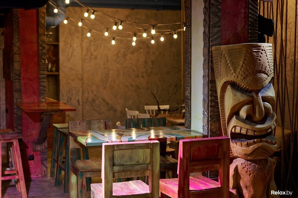 Заведение вышло очень самобытным; чтобы впечатлиться местной атмосферой, сюда достаточно зайти один раз. У входа встречает оптимистичный указатель и, конечно, тики-статуя: «он приехал из Гавайев; кстати, если положить руку ему в рот и загадать желание, оно точно сбудется».