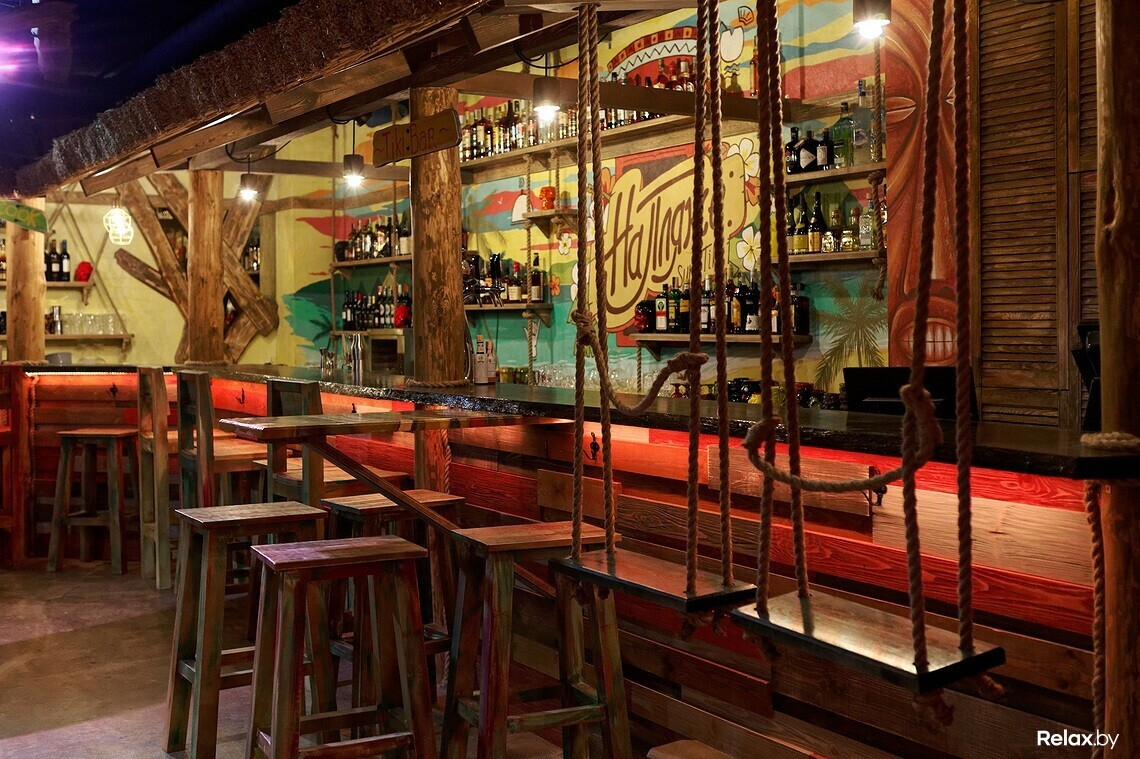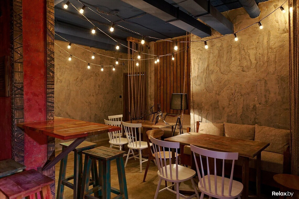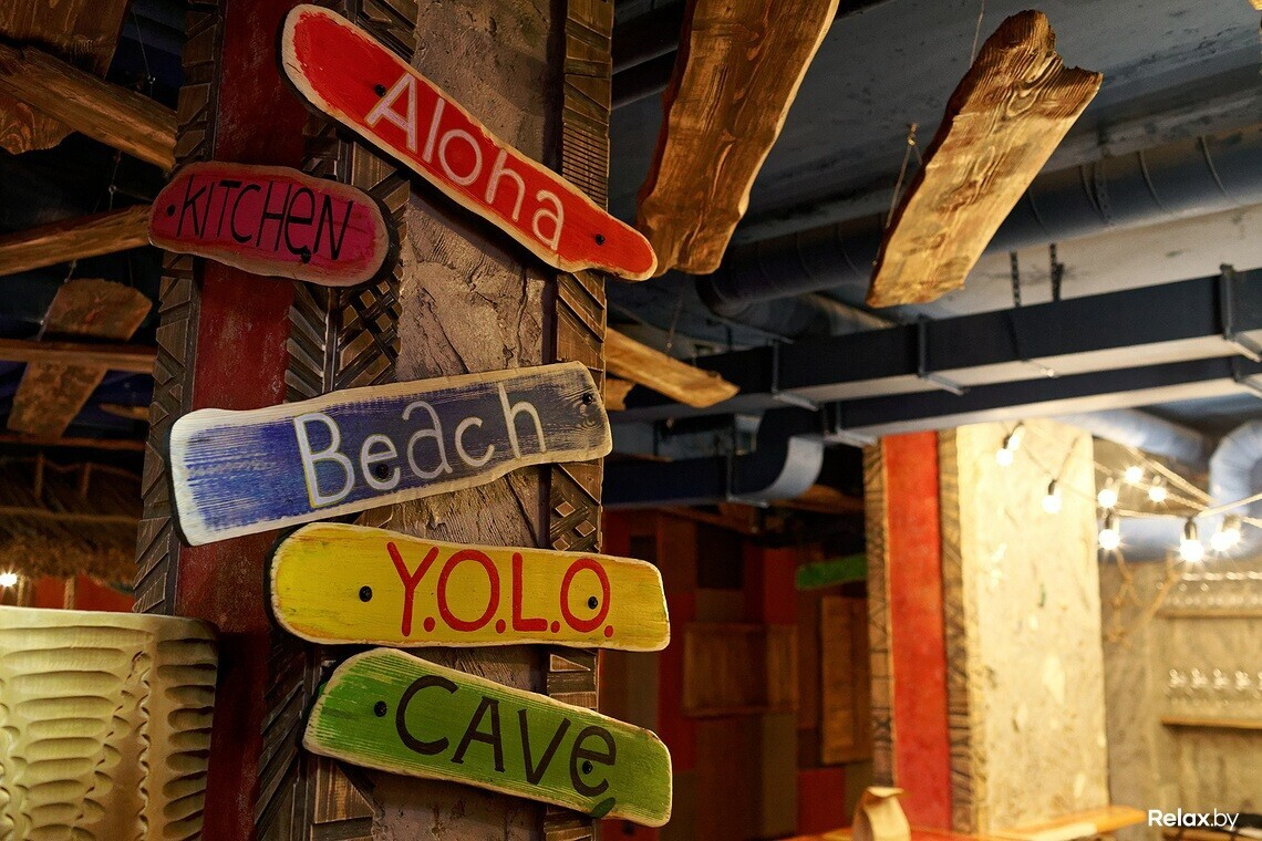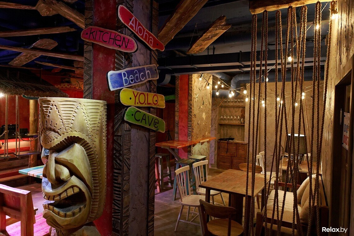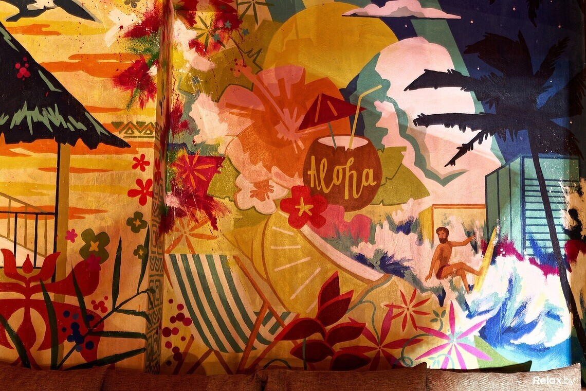 Соседствуют четыре условные зоны. Контактный пляжный бар растянулся почти на все помещение: здесь 30 мест, некоторые из них не стулья, а качели. Стены расписаны художником. Просторная зона предполагает танцы; в самом центре расположилась декорация, не лишенная практического смысла: внушительная бочка, на которую можно, оказавшись далеко от своего столика, поставить стакан с коктейлем.
