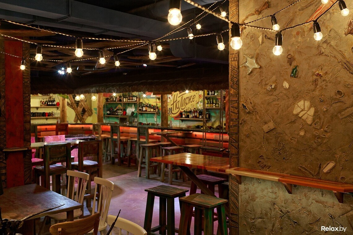 В бар «На пляже» стоит зайти ради знакомства с летней тики-культурой: самобытным интерьером, крутыми коктейлями, а еще — уличной едой и достойной авторской кухней. Дополнять атмосферу станет позитивная танцевальная музыка (по выходным — живая или DJ-сеты). Ценовой сегмент широкий. Строгого дресс-кода нет; комфорт гостей будет контролировать охрана. Курить в стенах бара нельзя.