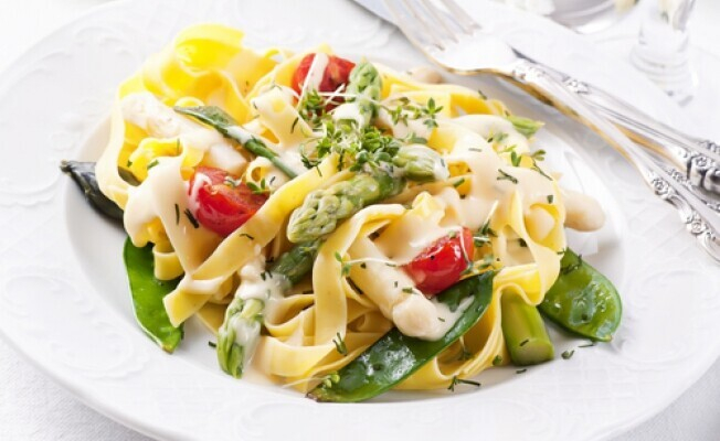 Теплый салат с крабами и спагетти