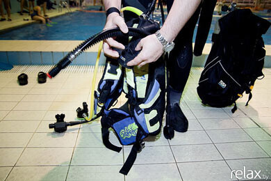 2. Для погружения необходимо снаряжение: маска, ласты, гидрокостюм (он спасает от холода: чем вода холоднее, тем костюм толще), грузовой пояс и, конечно же, акваланг или SCUBA (баллон с воздухом и дыхательной системой).
