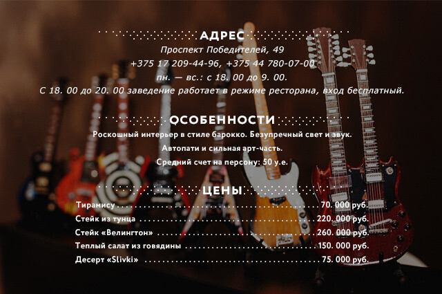 В «Slivki» действует строгий дресс-код, а с 18.00 до 20.00 заведение работает в режиме ресторана (вход бесплатный). Возможно, для вас будет важным, что курение в клубе разрешено. Кроме того, уже сейчас в клуб можно приезжать на afterparty.