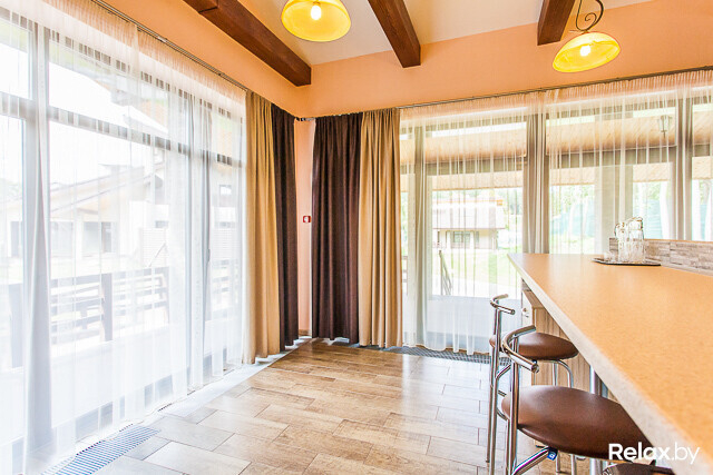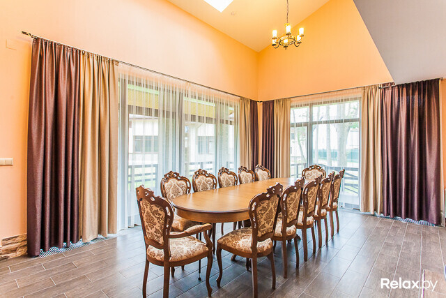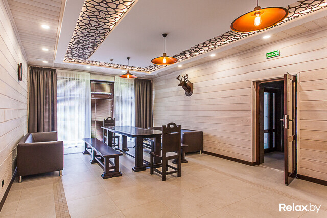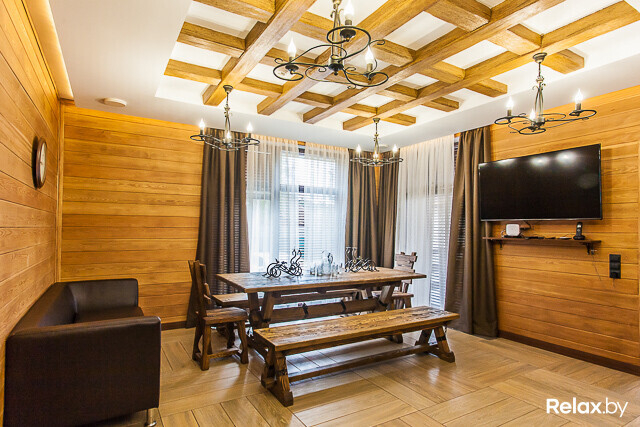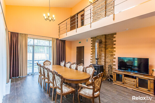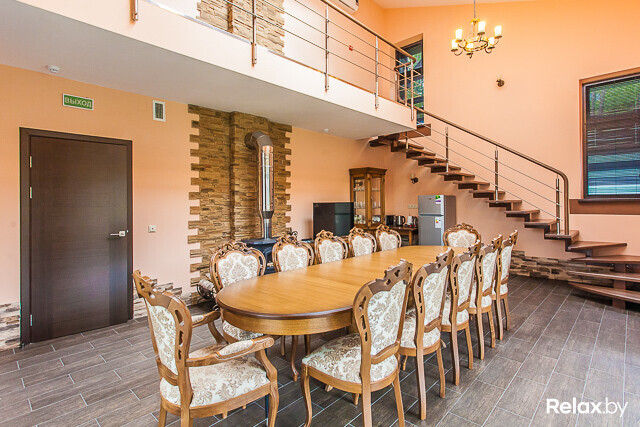 Для организации и проведения банкетов, семинаров, бизнес-встреч и небольших праздников можно воспользоваться банкетным залом, расположенным в двухуровневом доме. Во время застолья в зале смогут разместиться до 12 гостей, а при проведении фуршета — до 25.