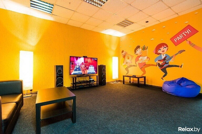 Новое игровое пространство представляет собой просторную комнату площадью более 30 м2, яркий интерьер которой сразу поднимает настроение. Внутри найдете все, что нужно для отдыха: мягкие кожаные диваны, кресла-мешки, столик, бесплатный wi-fi, ЖК-телевизор и мощная акустическая система.