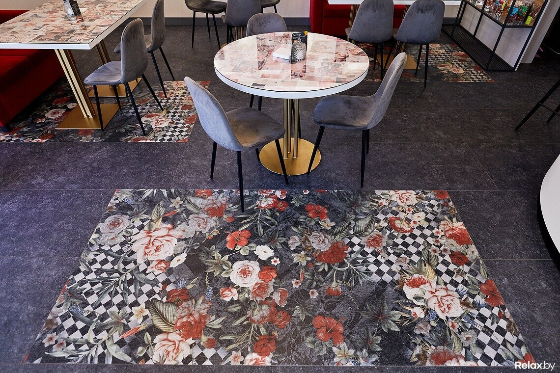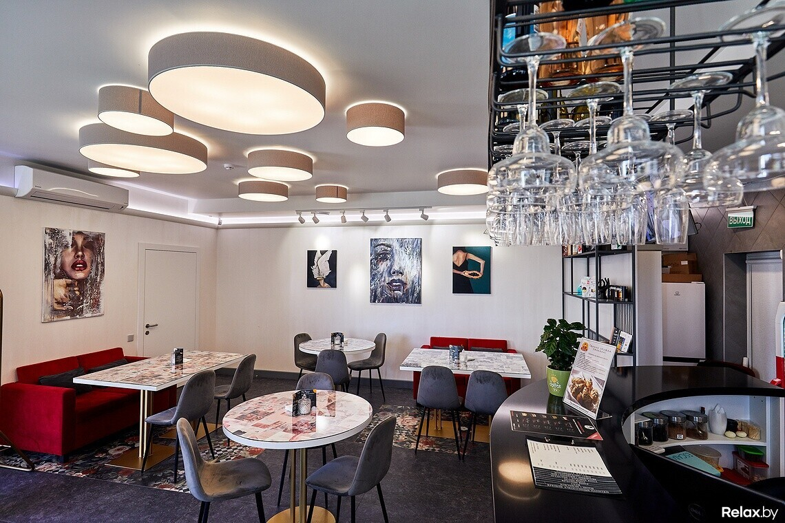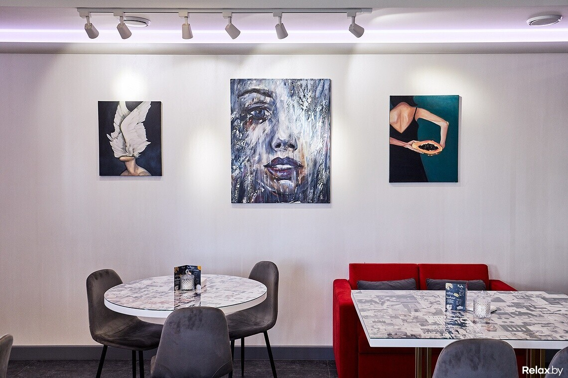 В зале на 17 посадочных мест три ключевых цвета: красный, серый и белый. На стенах картины белорусских художников, любую из них можно купить. Есть зона для детей и два стеллажа: один с книгами и журналами, второй с экопродукцией на продажу. В заведении можно купить «живые чипсы» (высушенные фрукты), гранолу для завтраков, фрукты в шоколадной глазури, кофе и чаи.