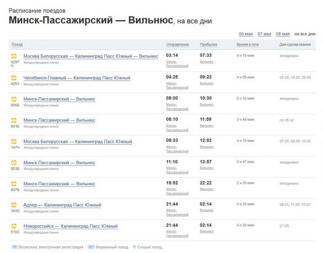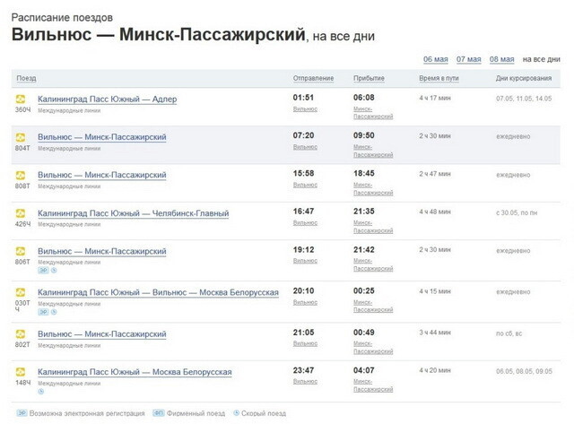 Достоинства: сегодня это самый популярный вид транспорта. Безусловно, плюсов у швейцарской электрички больше, чем минусов. В первую очередь это оперативность: поезд едет практически без остановок, а паспортный пограничный контроль проводится по пути следования. То есть вы не тратите огромное количество времени на прохождение границы. В Вильнюсе вы уже через два с половиной часа.Второй плюс — возможность уехать практически в любое время суток. В ту сторону и обратно ходят в настоящее время четыре поезда (в вечернее и утреннее время). В салонах поезда есть все удобства: комфортные сиденья, туалет, горячий кофе и многое другое. На фото смотрите расписание поезда «Вильнюс-Минск».