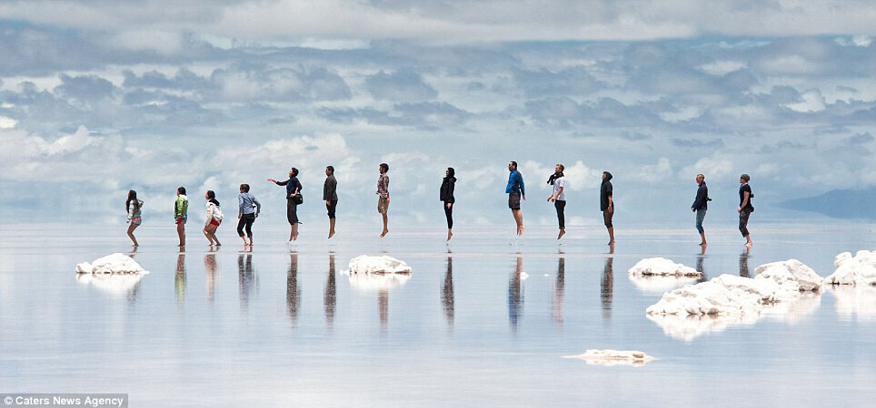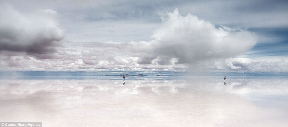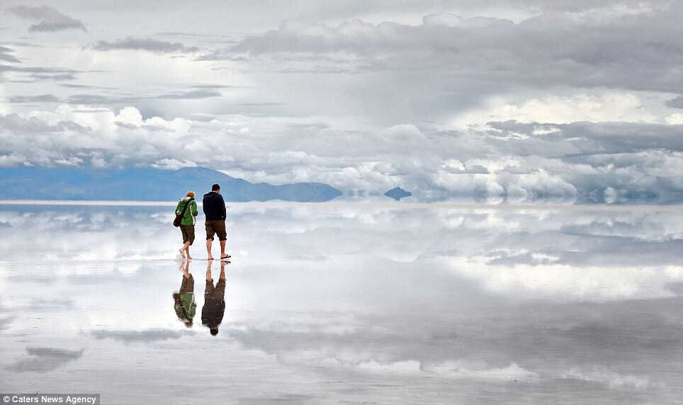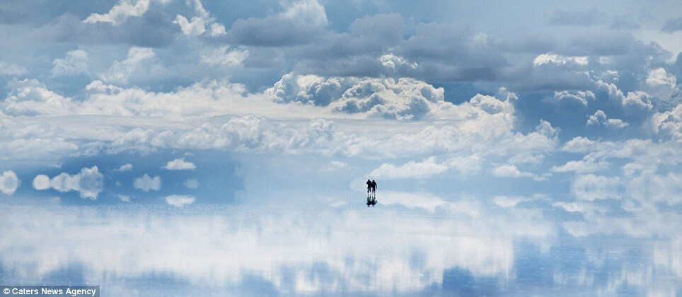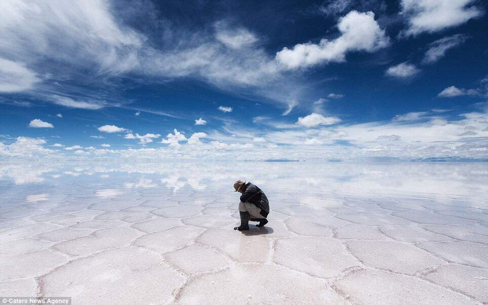 Это не фотошоп и не проделки фотографов. Салар-де-Уюни – самое крупное высохшее соляное озеро в мире, оно находится в Боливиина высоте около 3650 м над уровнем моря. Внутренняя часть озера покрыта слоем поваренной соли толщиной 2—8 м. Во время сезона дождей солончак покрывается тонким слоем воды и превращается в самую большую в мире зеркальную поверхность.