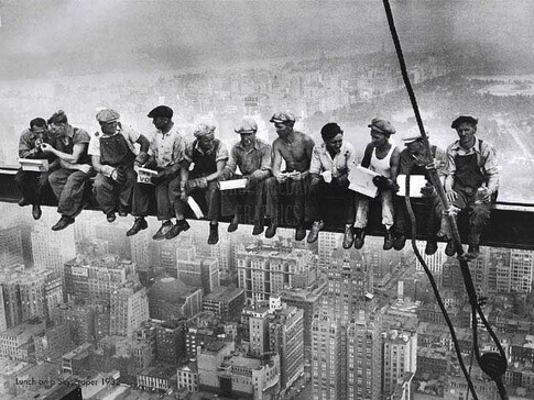Смелые строители, обедающие сидя на балке 69 этажа будущего здания Рокфеллер Центра, были сфотографированы Чарльзом Эббетсом (Charles C. Ebbets) в 1932 году На сегодня из 11 мужчин, сидящих на балке, опознано только семеро.
