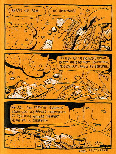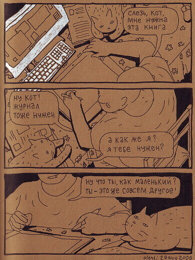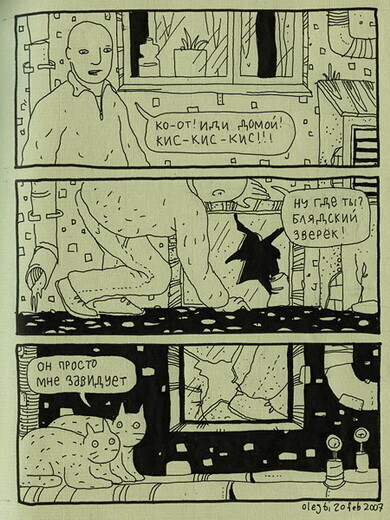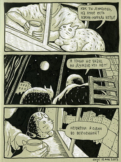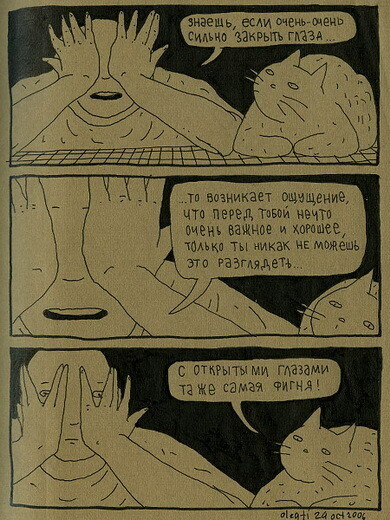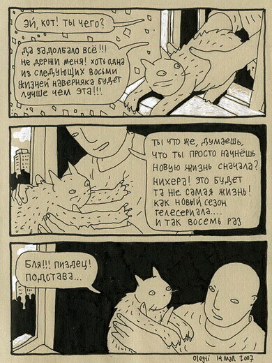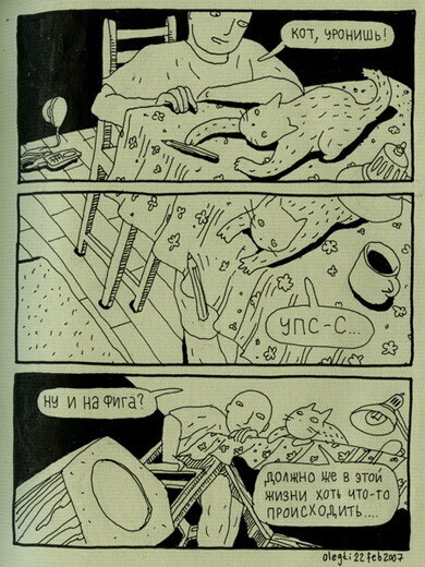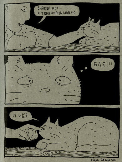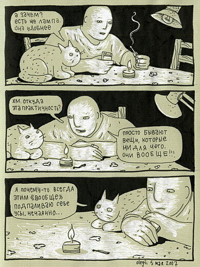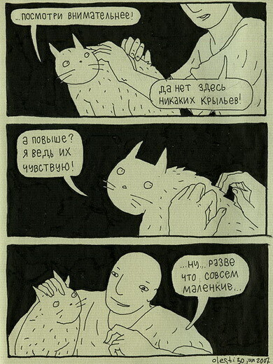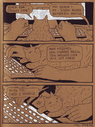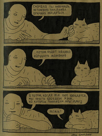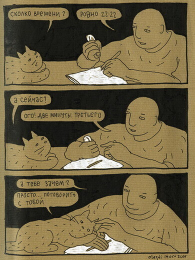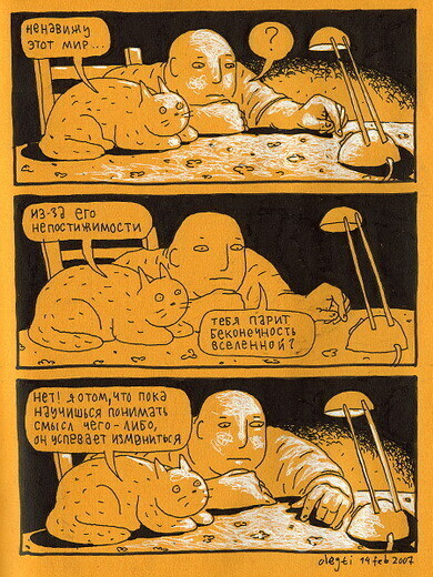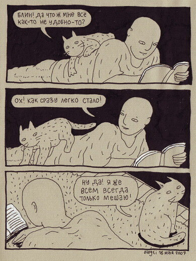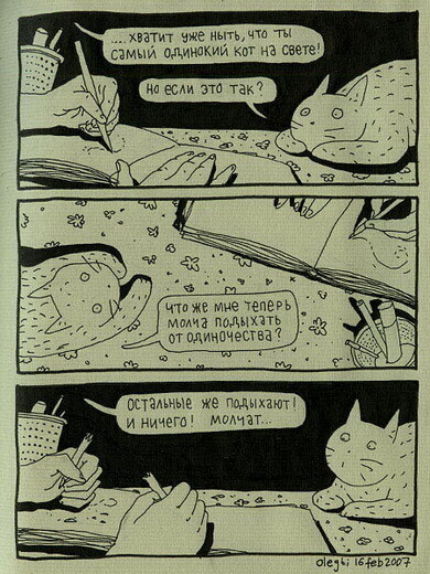 Если вы его еще не знаете, то пора вам познакомиться. Знаменитый кот Рунета, нарисованный Олегом Тищенковым, любит размышлять о жизни, филосовствовать, делать интересные умозаключения. И выглядит все это весьма мило и трогательно. Может вам пора обратить внимание и на вашего любимца? Вдруг он скажет вам много нового.