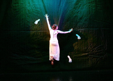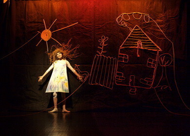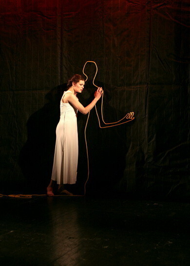 У слепых же все по-другому. В детстве эта девушка видела, потом потеряла зрение. Она помнит какие-то картинки, но этот ее мир рушиться. Для того чтобы это воплотить нужна была плоскость, так появился задник с липучкой и цветные шнуры. А еще я где-то читала, что слепые видят не просто темноту, а какие-то цветные полоски… (В спектакле с помощью шнуров, то выкладываются картинки, то выражается внутреннее состояние героини, когда они просто хаотично набрасываются на задник, «нервы» — Е.М.).