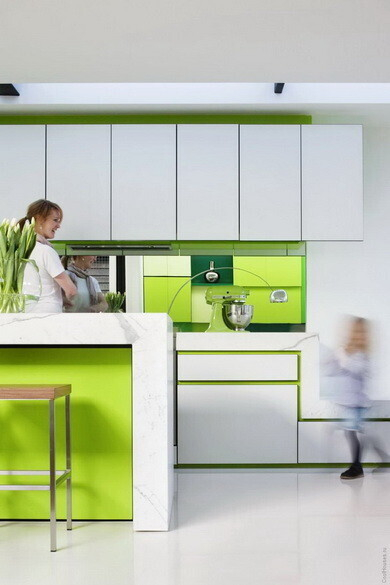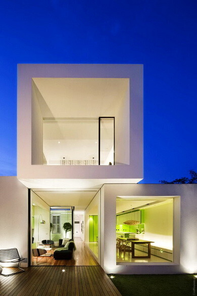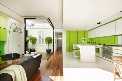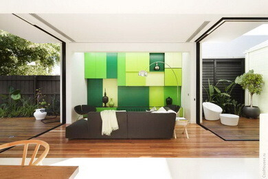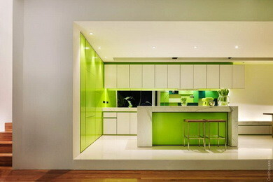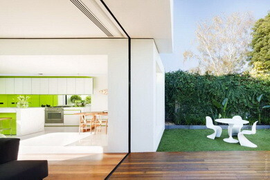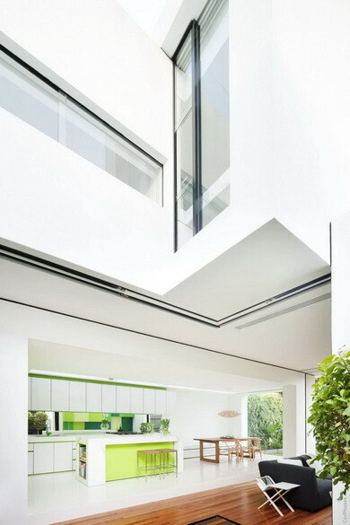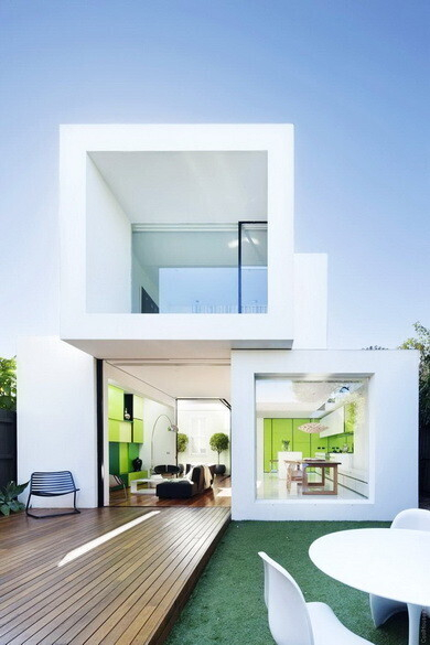 Три больших куба — это и есть архитектурная задумка компании Matt Gibson Architecture, построившей эксклюзивный дом в Австралии. Таким образом, жилое пространство делится на три зоны — кухню, гостевую, личную. Преобладающий цвет — белый с зелеными вставками. И в итоге — очень светлое и воздушное пространство, в котором очень комфортно жить.