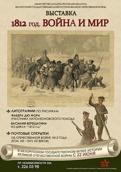Прошло уже двести лет с того момента, как на наши земли обрушился Наполеон со своими войсками, но тема войны 1812 года по-прежнему актуальна. Ответ на вопрос «почему» вы наверняка найдете на выставке, приуроченной этим историческим событиям. Организаторы утверждают, что посетители музея смогут увидеть события двухвековой давности глазами очевидца. Такому восприятию будут способствовать около 100 литографий по рисункам участника наполеоновского похода на Россию Фабера дю Фора и других, а также многочисленные гравюры и открытки. Кстати, экспозиционный блок «Беларусь» рассказывает о тех же событиях, опираясь на почтовые открытки XIX – нач. XX веков и их увеличенные копии. Они в свою очередь иллюстрируют военные сцены, репродукции известных художников, памятники, памятные места войны 1812 года.