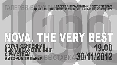 В честь того, что эта выставка стала юбилейной и 100-ой по счету, возникла идея собрать все самое лучшее за долгое время. Пришлось даже нарушить свое же правило показывать только кураторские проекты в галереи «NOVA». Судя по всему, это не единственное предписание, которое в этот раз игнорируется. Дело в том, что организаторы создали совершенно нестандартные условия, назвав событие выставкой-хеппенингом. Стать соавтором экспозиции может любой желающий: кто в день открытия галереи принесет свою лучшую фотографию в раме или наклеенную на пенокартон. Юбилейная выставка обещает стать интересной и непредсказуемой, ведь не существует предварительного кураторского отбора, согласованных списков участников, жанровых и тематических ограничений. Открытие состоится 30 ноября в 19:00.
