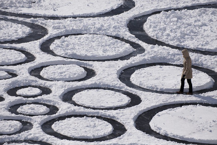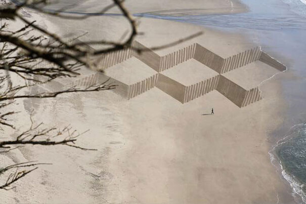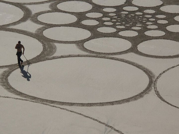 Глядя на четкие линии этих рисунков на песке, сложно представить, что это дело рук человека. Одного человека. Человека с палкой. А зовут его Джим Деневан, он живет в Америке, в Северной Калифорнии, и за 17 лет нарисовал уже сотни подобных шедевров по всему миру, использую для этого простую палку. Его рисунки остались лишь на фотографиях, так как жизнь их коротка – они уходят вместе с приливом. Помимо этого, Джим увлекается серфингом, сам освоил профессию повара, издал книгу и является организатором передвижного фестиваля кулинарии «Outstanding in the Field».
