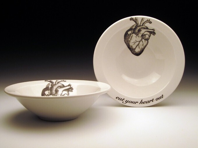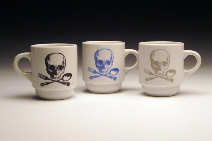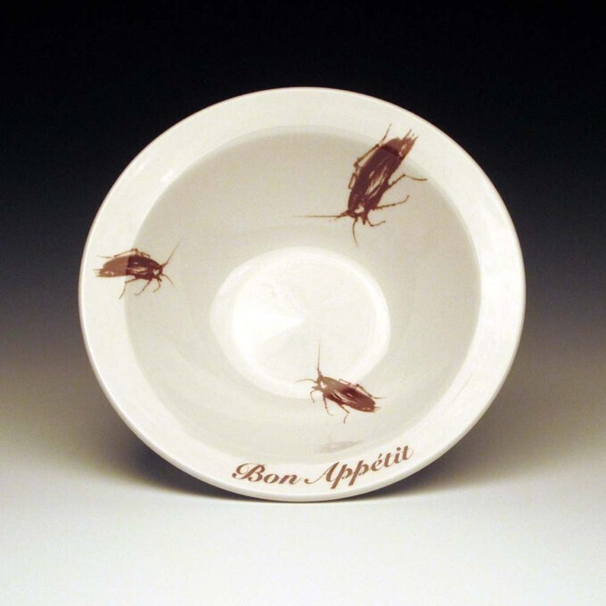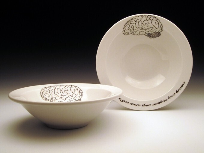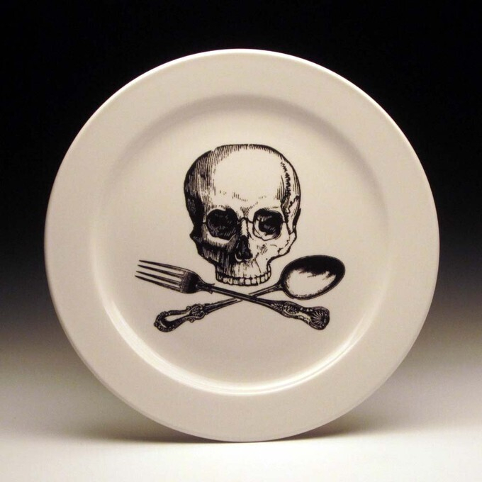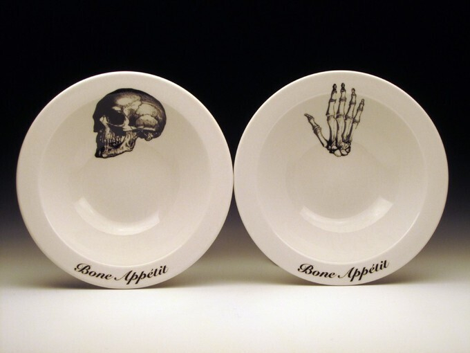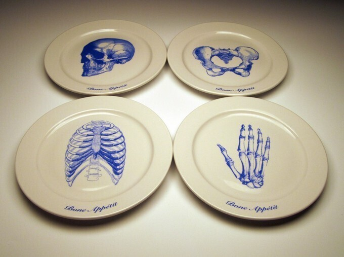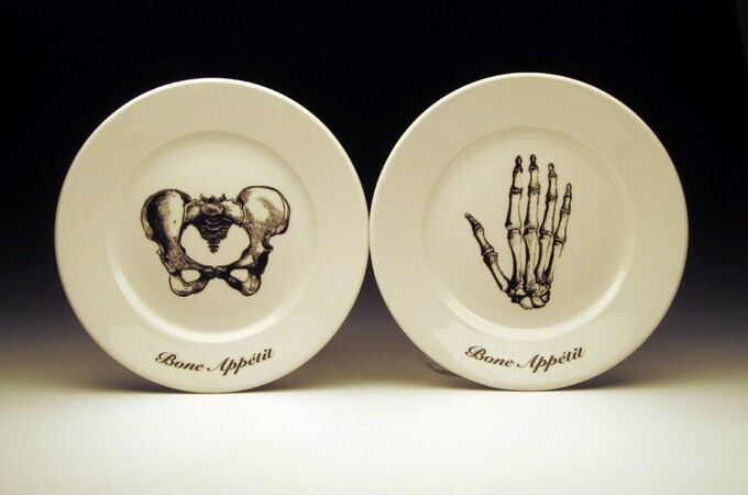 Хорор тарелочки придумала 27-летняя Мередит Хост (Meredith Host) aka Foldedpigs, дизайнер из Детройта и любительница фильмов ужасов. Кости, черепа, мозги и тараканы — обед из такой посуды уж точно запомнится надолго, тем более особо впечатлительным. Зато эксклюзивно!