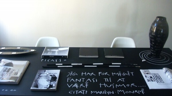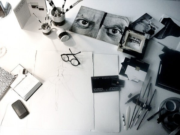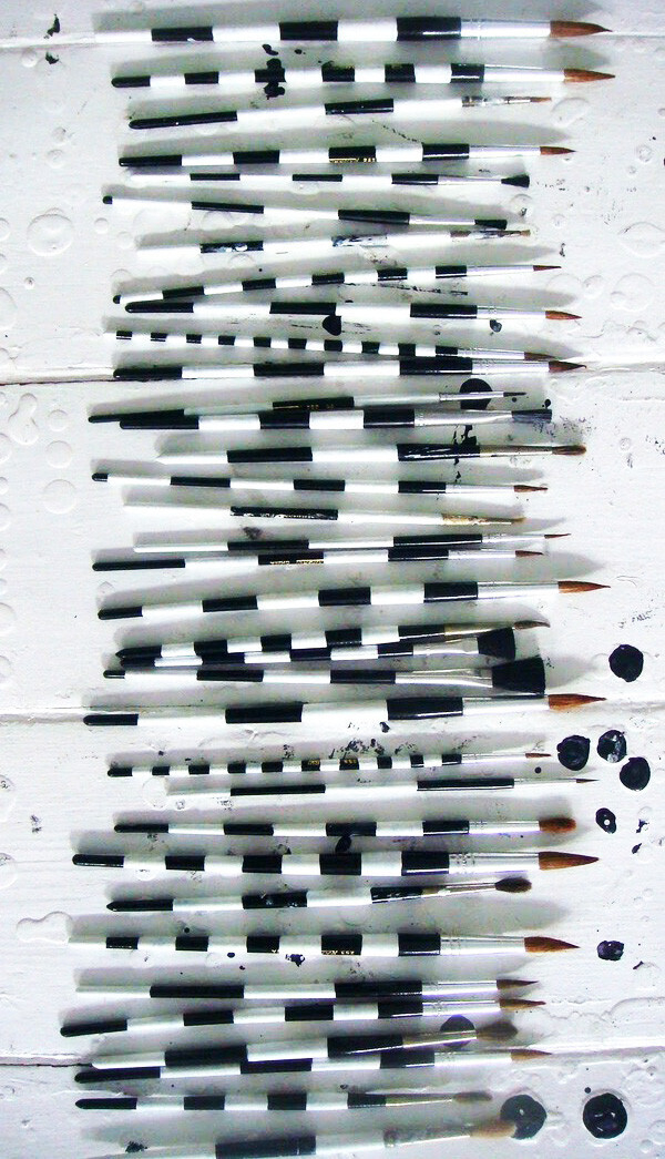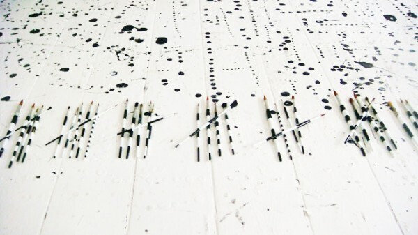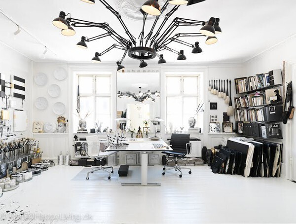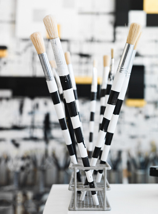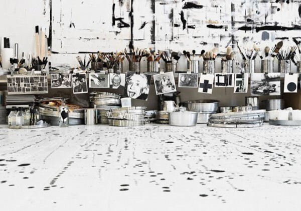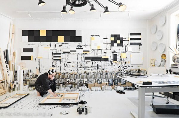 Черно-белая студия датской художницы Tenka Gammelgaard выглядит очень стильно. Черные капли на полу, белый холст, черно-белые фтографии, кисти в полосочку — практически ни одного яркого пятна. И как все-таки ярко!