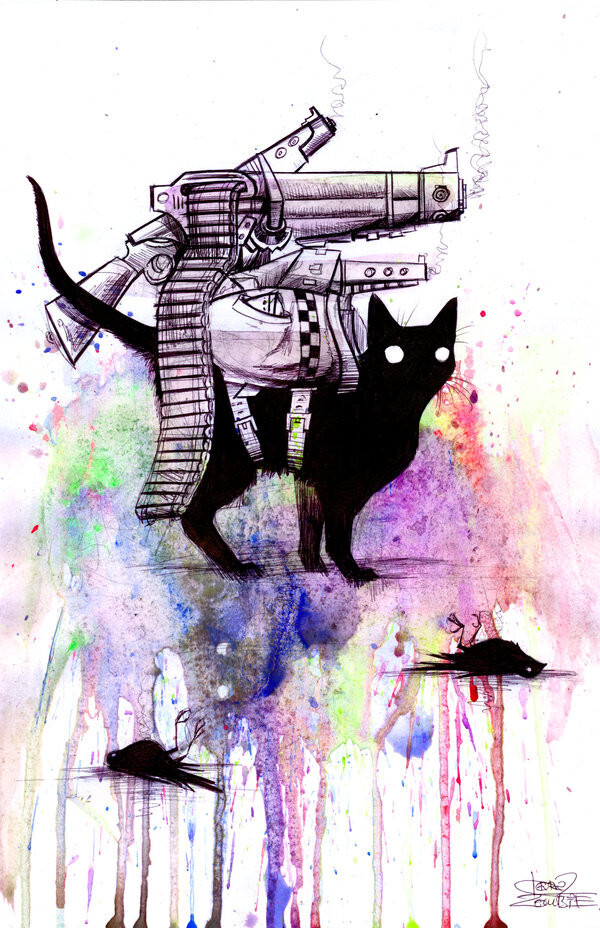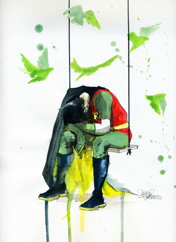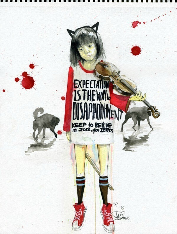Лора Зомби (Lora Zombie) выплескивает свои фантазии на бумагу при помощи чернил и акварели. Немного грустные и мрачные, лишь с несколькими яркими пятнами, но множеством подтеков, они как будто отсылают в глубину сновидений и причудливого вымысла. Интересно посмотреть, но порой жутковато.