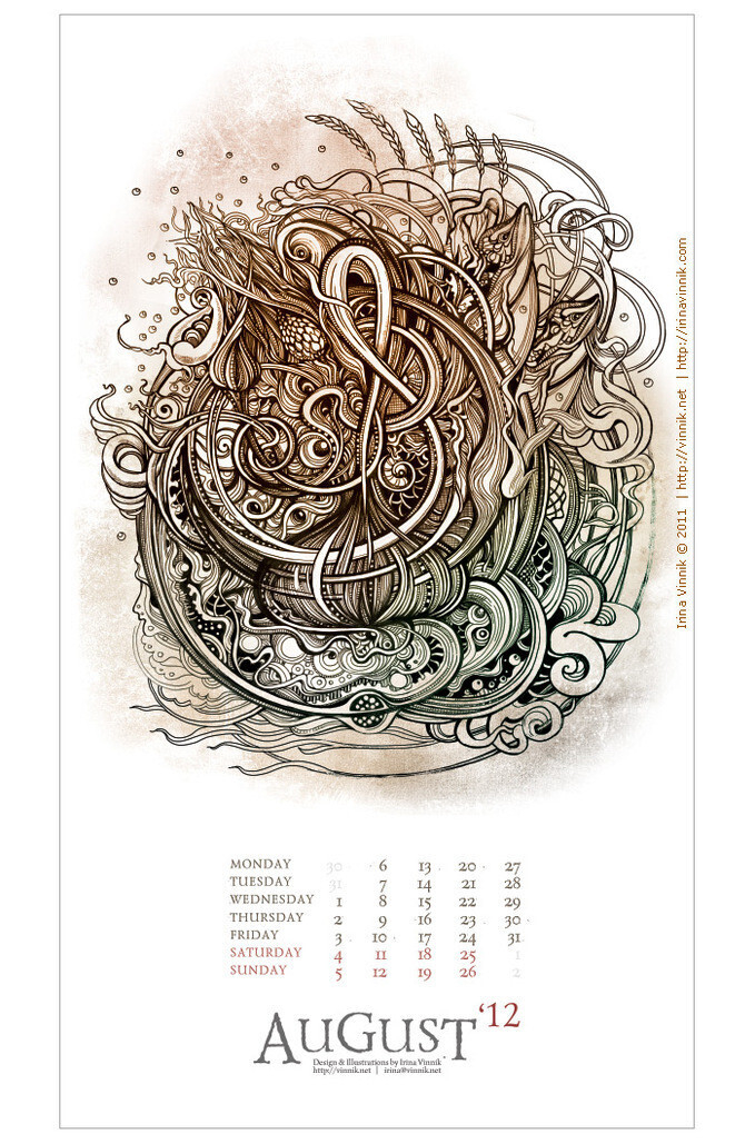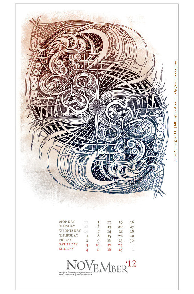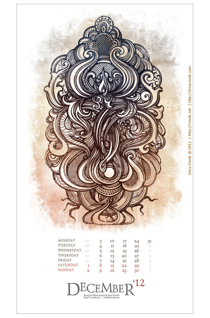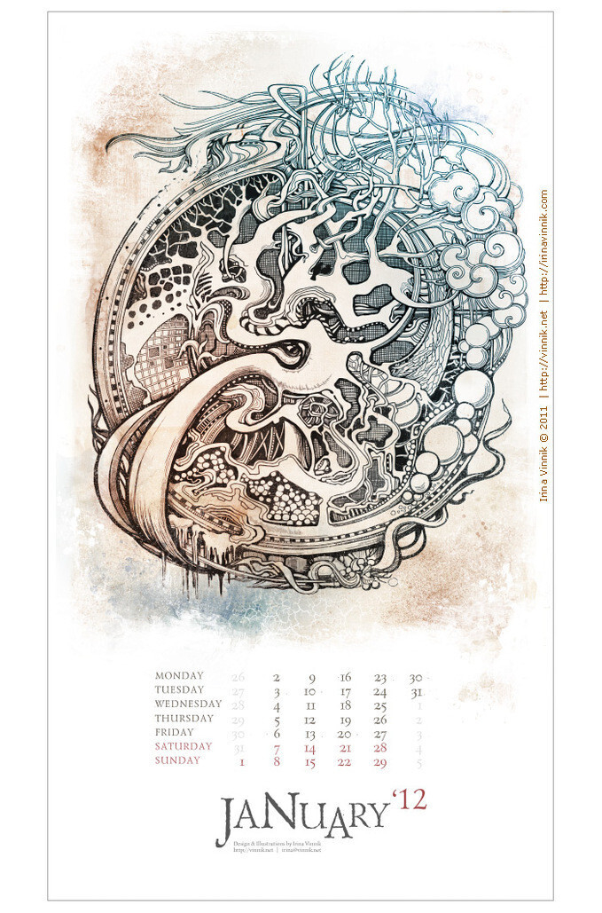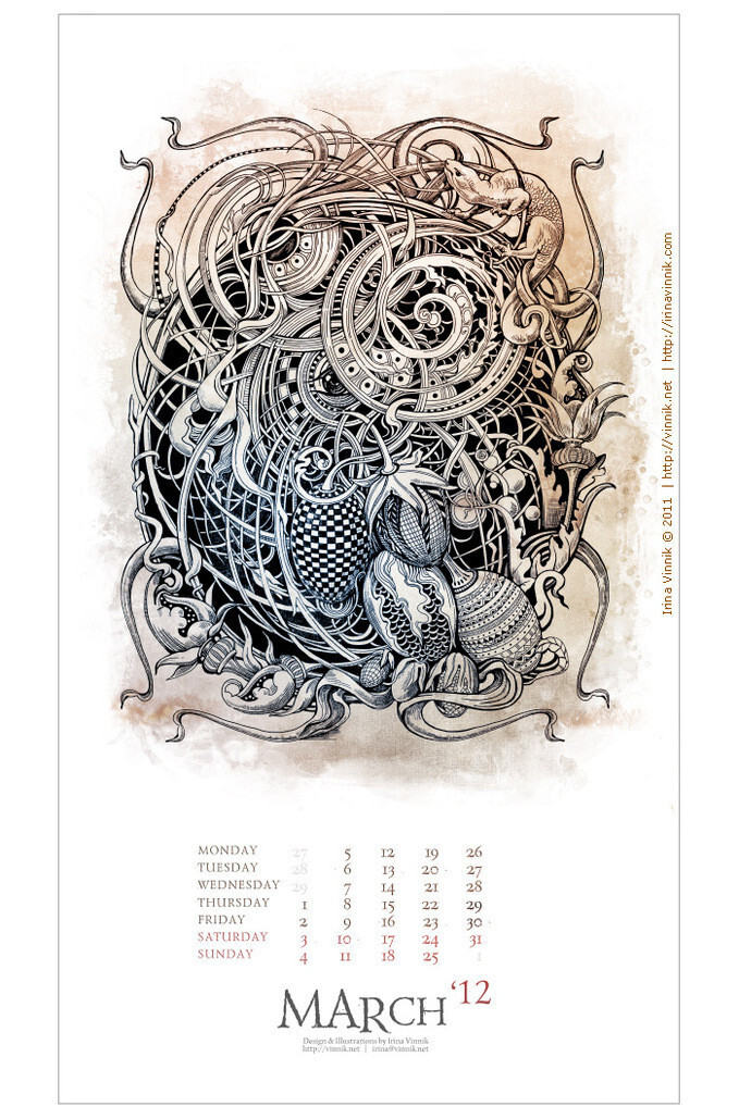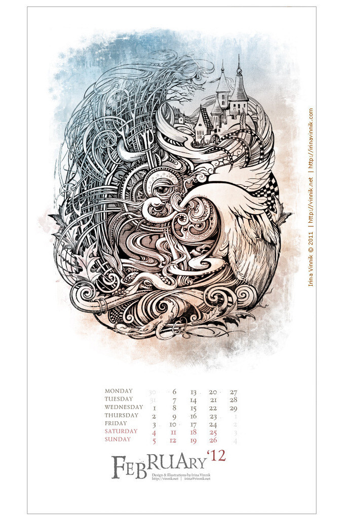 Ирина Винник, дизайнер из Санкт-Петербурга, выпустила потрясающий календарь — пример настоящего произведения искусства из области графики и каллиграфии. В его рисунках много мелких деталей, скрупулезно проработанных рукой мастера. Рассматривать их очень интересно.