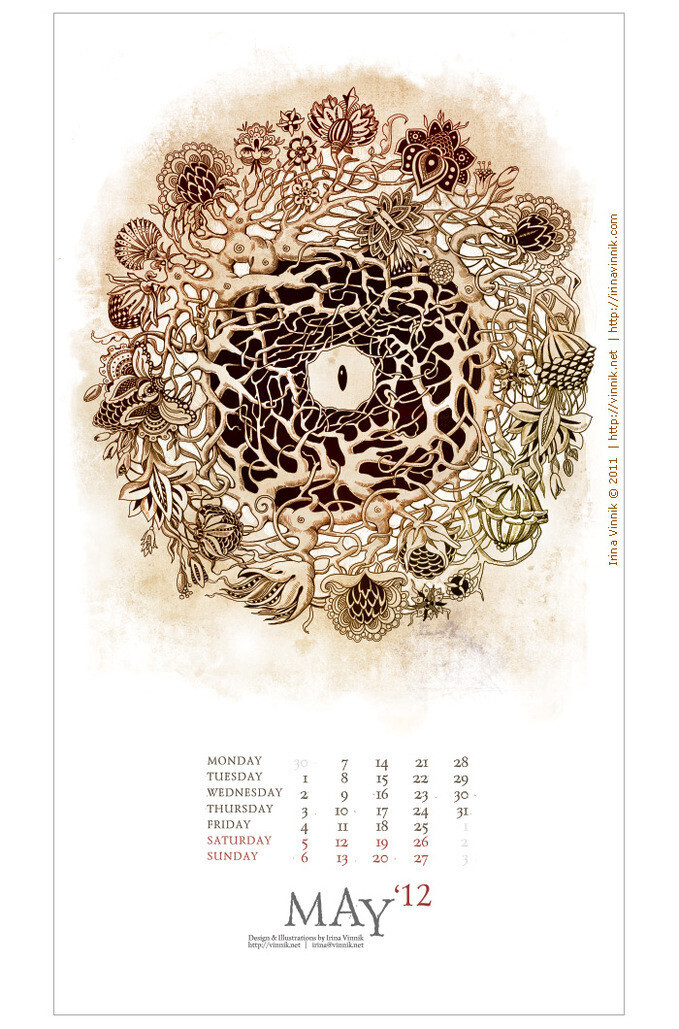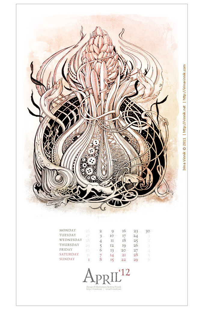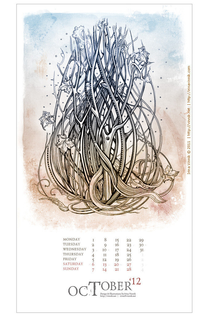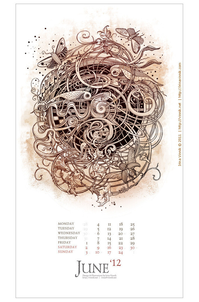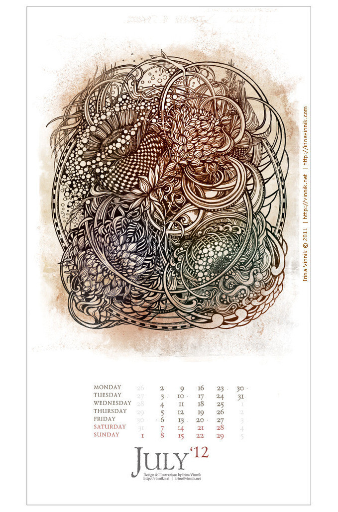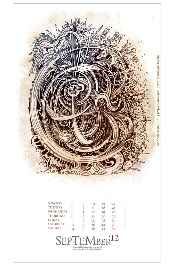 Ирина Винник, дизайнер из Санкт-Петербурга, выпустила потрясающий календарь — пример настоящего произведения искусства из области графики и каллиграфии. В его рисунках много мелких деталей, скрупулезно проработанных рукой мастера. Рассматривать их очень интересно.