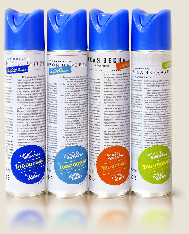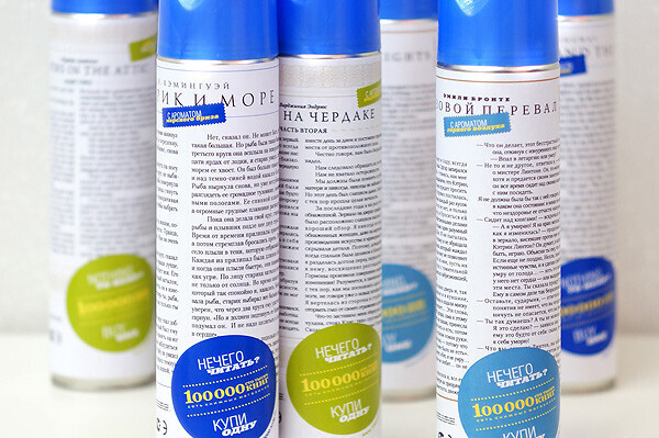 Именно такова концепция необычной рекламной компании, которая развернулась на просторах туалетов Екатеринбурга. Как оказалось, чаще всего мы читаем именно в туалете. Только вот читаем первое попавшееся в руки – баллончик для освежителя воздуха. Так почему бы не разместить на нем странички высокоинтеллектуальной прозы и тем самым не обратить большее количество людей в ряды читателей книг?