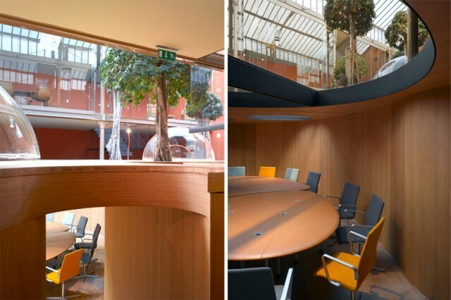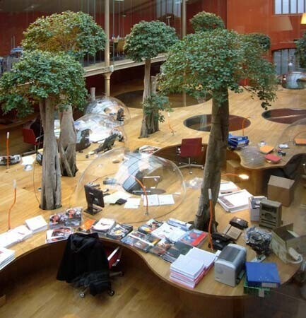 Как редко мы бываем на природе. И как часто вздыхаем об этом, сидя в душных офисах. Французская архитектурная фирма Christian Pottgiesser решила проблему очень просто. Если нельзя нам на природу, то почему бы не впустить ее в сам офис. Теперь сотрудники двух французских компаний Pons и Huot вздыхают не так тяжело. Ведь в их столы вмонтированы деревья, а над головой – прозрачный купол.
