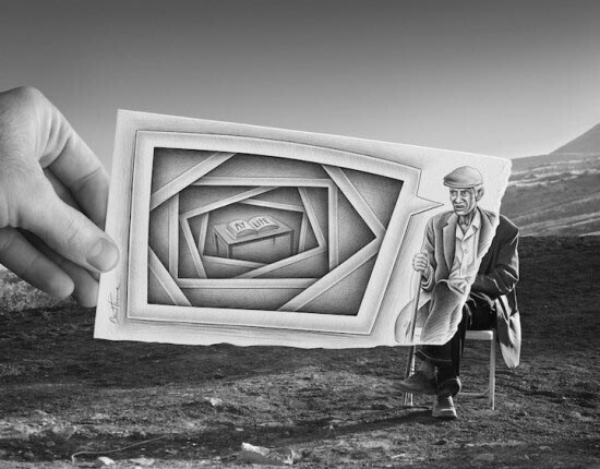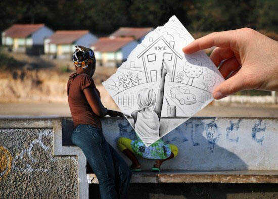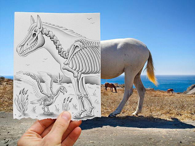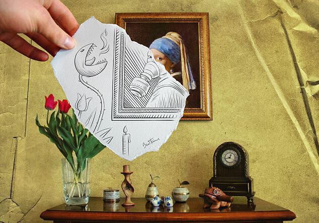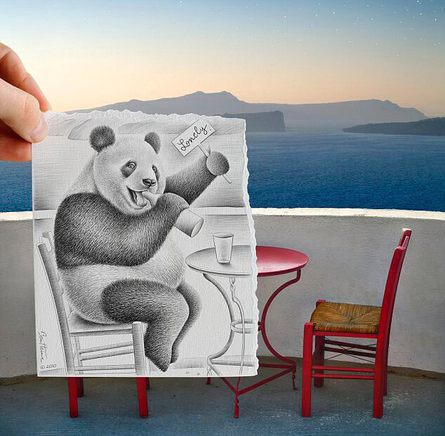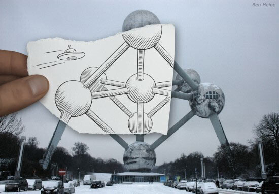 Бен Гейне (Ben Heine) дорисовывает реальность, и делает это очень интересным способом. Он не является ни профессиональным художником, ни профессиональным фотографом. Однако именно эти две профессии сочетает в своем творчестве. Идея этих иллюстраций состоит в том, чтобы противопоставить рисунок и фотографию. Но в итоге получается очень интересная и креативная работа, вызывающая улыбку и интерес, чего уже достаточно для начала творческой карьеры.