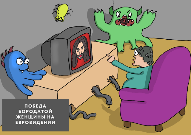 «В этом году победительница (или победитель) Евровидения взровала всю Европу. Кто бы мог подумать, что австрийцы так нестандартно мыслят? Нынче женщины открыто завидуют красивым ногам женщины с гормональным сбоем, а мужчины мечтают о такой роскошной бороде. Однако мужчинам я бы все же посоветовала не забывать, что борода идет не всякому».