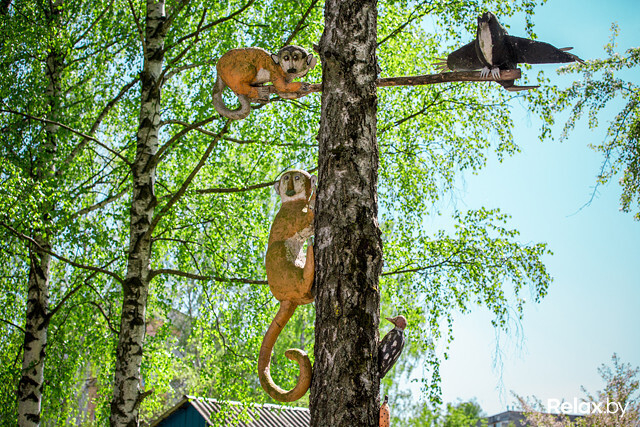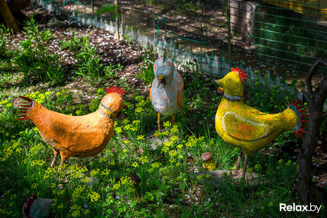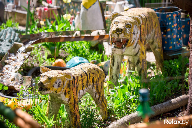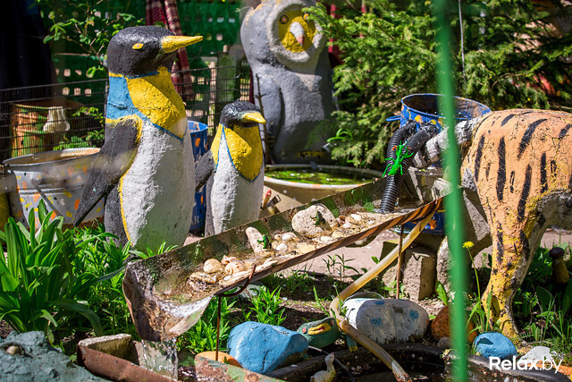 — Ездили с женой на Птичь и увидели беседку, украшенную фигурками аистов. Я тут же захотел сделать таких же у себя во дворе, — рассказывает Анатолий Владимирович. — Как быть? Глину я месить не могу, гипс — не умею. Решил делать из пенопласта. Нахожу его на мусорках, там же беру арматуру. Вот, петух-флюгер, видите? Он на подшипниках, которые я тоже нашел. Краску и клей покупаю в магазине на свои сбережения. Иногда домоуправление помогает, вот для водопада дали поддон, но камни и систему циркуляции я делал сам. Главное, в моем зоопарке вы можете увидеть животных, которых никогда не встретите в обычной жизни.