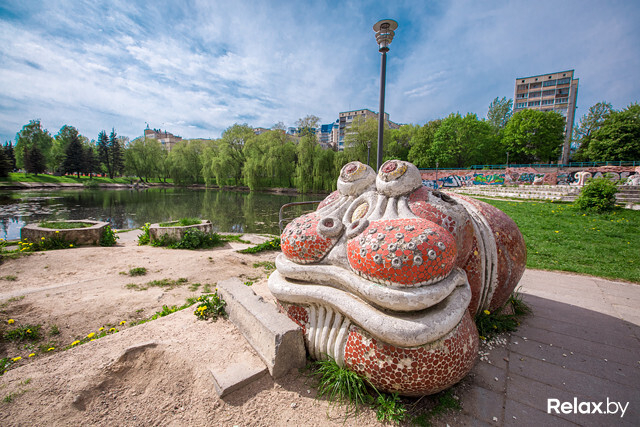 Осьминог, лягушка, крокодил, морской конек и прочие дары моря появились в парке у пруда на Харьковской еще в 1976-м. Скульптуры часто сравнивают с барселонскими шедеврами Гауди. А от местных мы слышали историю, будто у этих каменных даров моря такие фактурные губы, потому что их создатели-скульпторы, мол, повально увлекались африканской культурой.