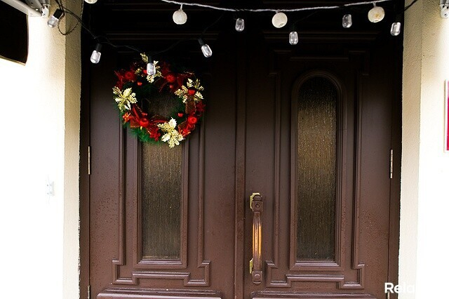 Скромный вход в бар-кальянную напоминает дверь в уютную квартирку на узкой европейской улочке под Рождество.