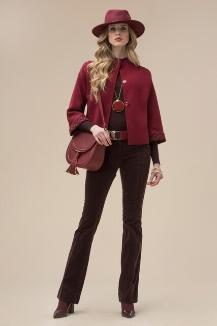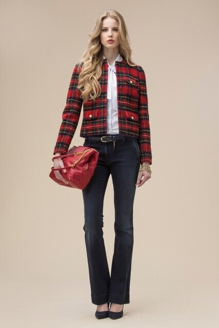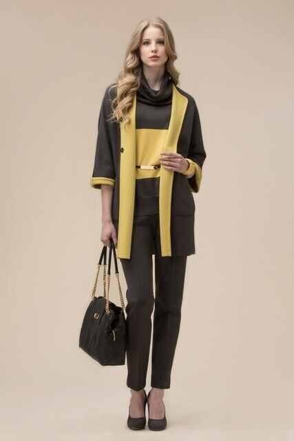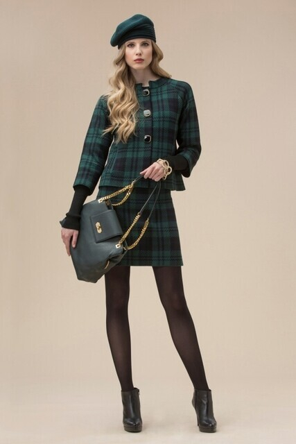 Одежда создана из классических или ультрасовременных тканей: камвольной шерсти, трикотажной шотландки благородных красно-синих или черно-зеленых расцветок. В палитре оттенков отдали предпочтение тонам сливового, синего и серого, горчичного, карамельного и оранжевого и других актуальных цветов.