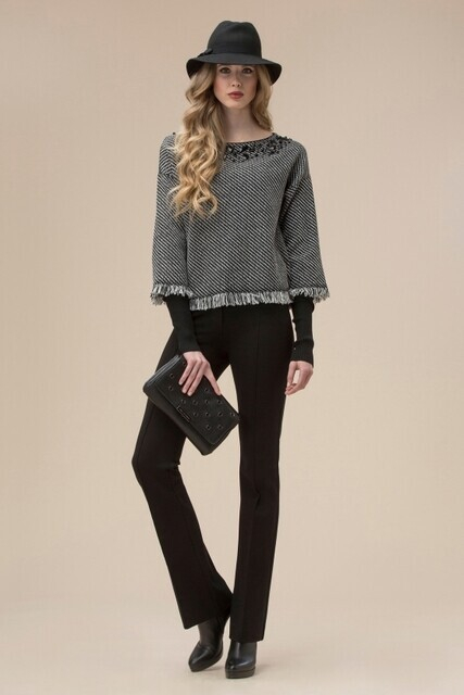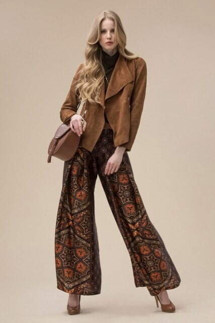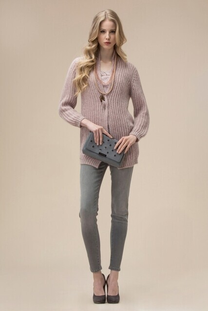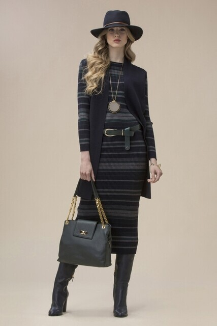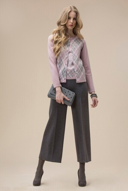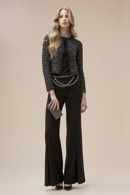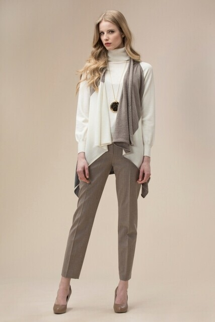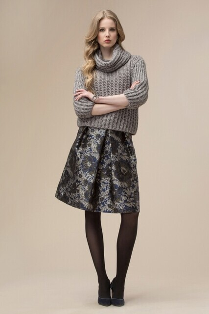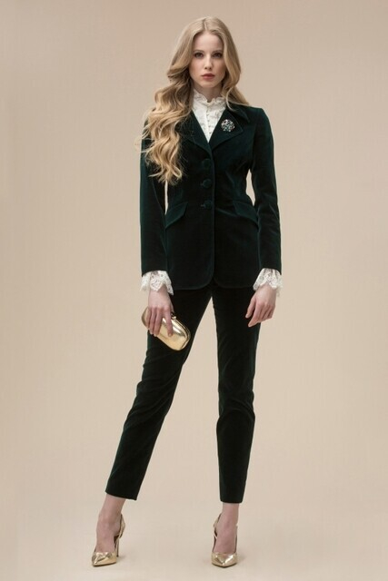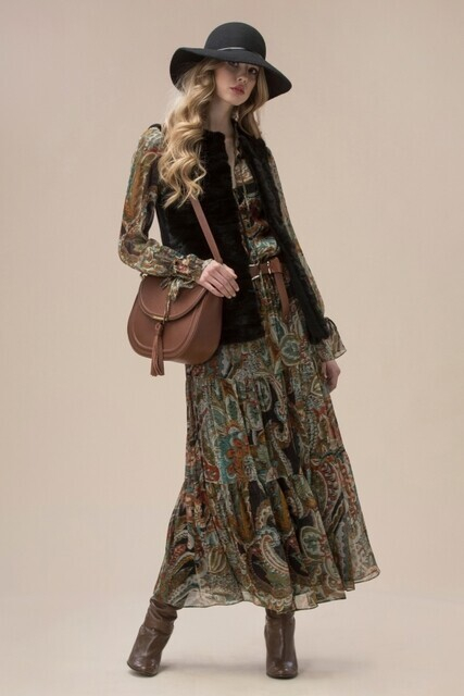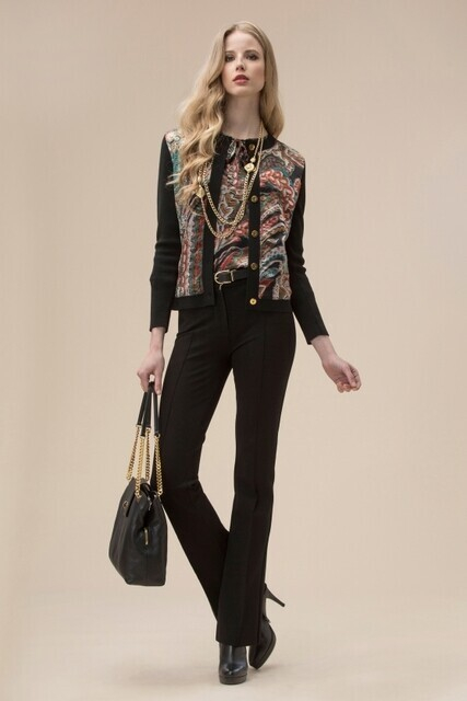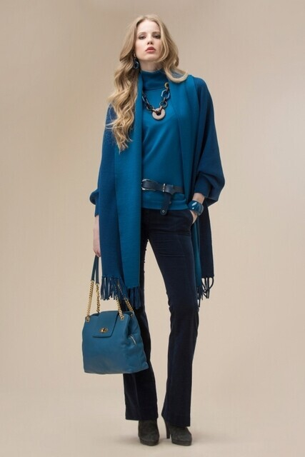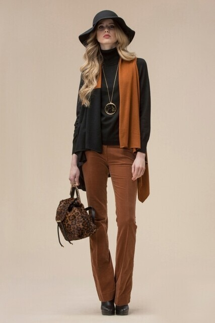 В ассортименте — изобилие водолазок, жилетов, кардиганов из мохера, люрекса и ангоры. Найдутся и шикарные платья, юбки. Стиль костюмов навеян классической мужской английской модой, country chic и даже урбанистическим стилем, а также модой 70-х с их брюками-клеш от колена, этническими принтами и цветными полосами. Есть и британский рок-стиль, к какому отсылают гламурные брючные бархатные костюмы насыщенных огненных и зеленых оттенков, летящие платья в пол стиля хиппи в сочетание с широкополыми шляпами и меховым жилетом.
