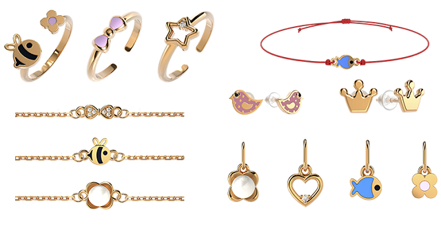 В новой коллекции Kids new — изделия, украшенные разноцветными эмалями и фианитами, а также много регулируемых браслетов на шнурках и безразмерных колец.