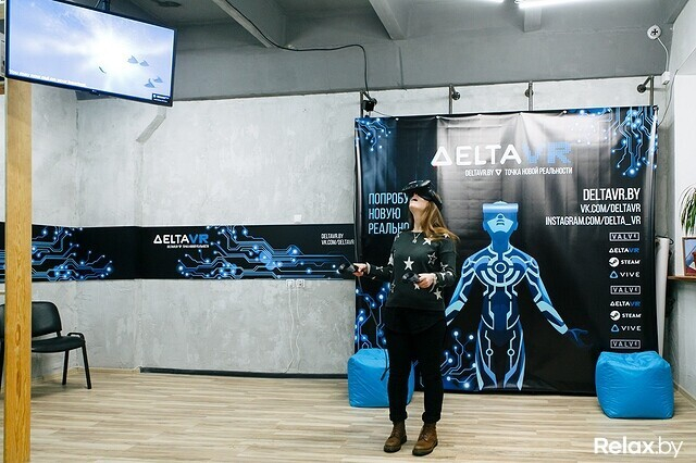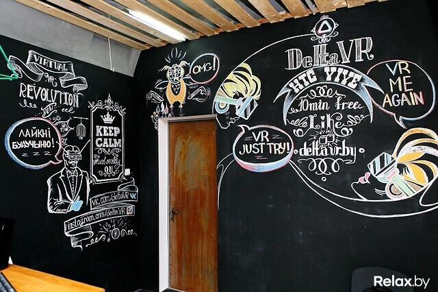 От прочих точек новый DeltaVR отличен тем, что стремится задержать гостей подольше. Аналогичные предложения в торговых центрах Минска предлагают кратковременное погружение как аттракцион. В этот клуб зовут компанией в 2-4 человека, предлагают посидеть подольше, посмеяться друг над другом (на экран выводится все, что видит человек в очках). Кстати, оформляли эту комнату, имитируя столкновение времен. В шлеме вы погружаетесь в технологию будущего, зато вокруг — отголоски прошлого: старые приемники, книги, картинки. Тут есть кресла-мешки, пуфы.