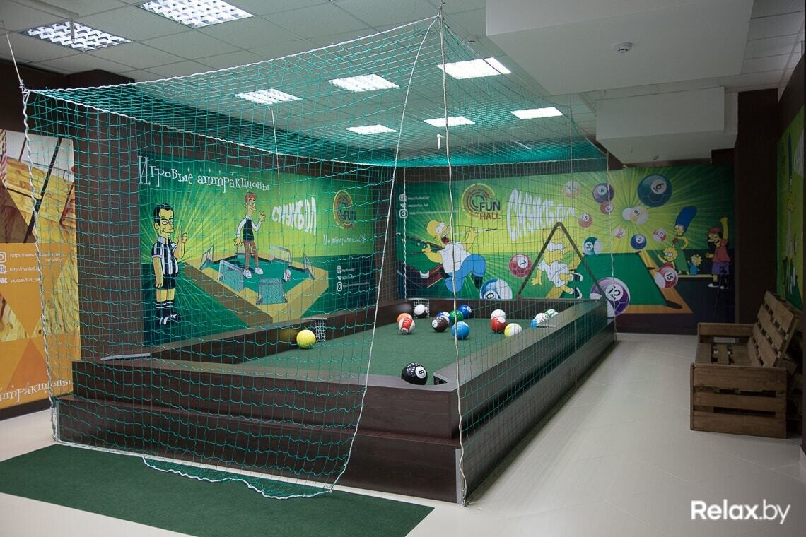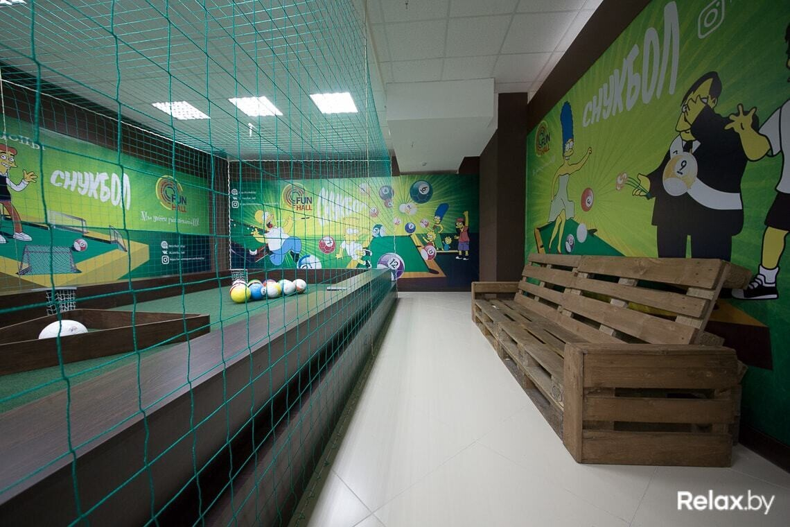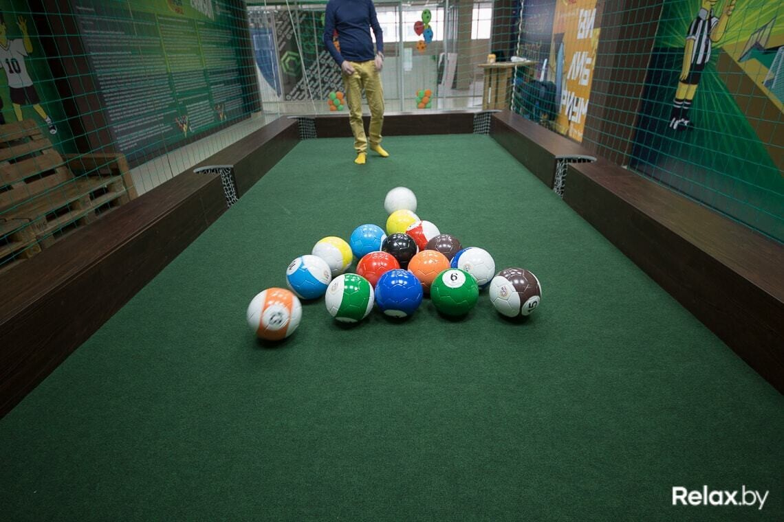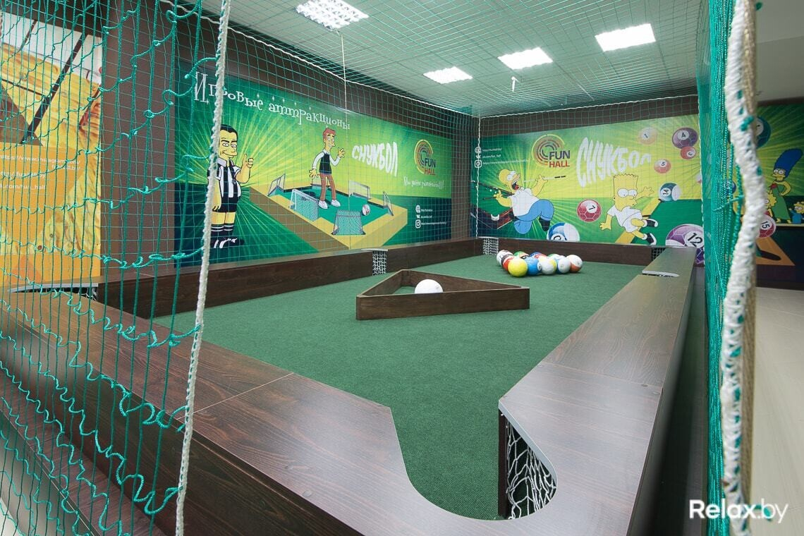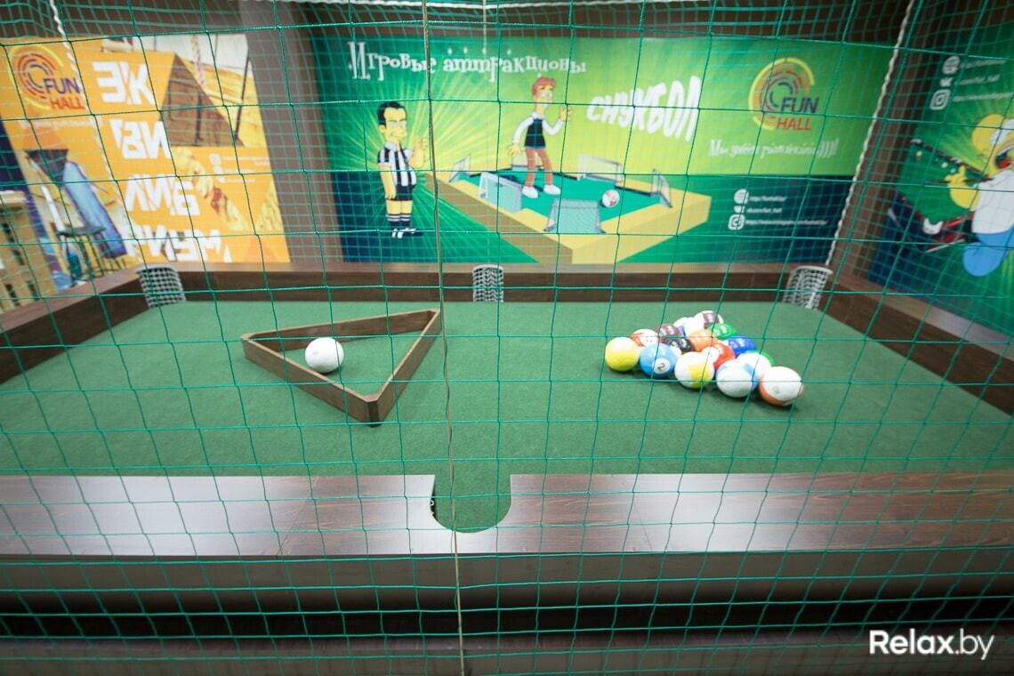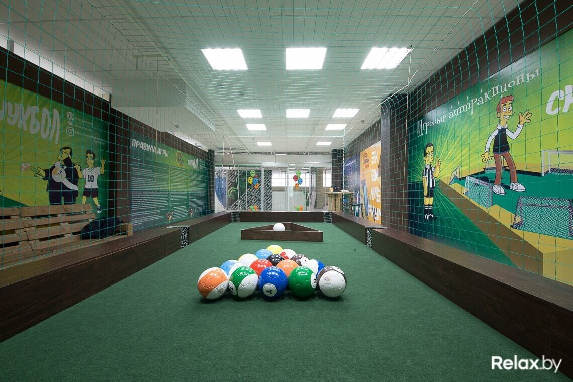 Снукбол представляет собой подиум в виде большого бильярдного стола, на котором участники играют в американский бильярд, «разбивая» ногами специальные мячи с пониженной инерцией. Максимальное количество человек — 4, играть можно на протяжении 10, 30 или 60 минут. Стоимость игры составит 7, 15 или 25 рублей соответственно (плата за стол, а не за одного человека).