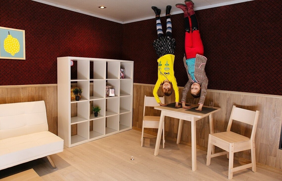 Здесь вестибулярный аппарат и чувство пространства поджидает еще одно испытание. В Комнате гравитации все в буквальном смысле вверх ногами. Даже розетки. Зато можно ходить по потолку, вообразив себя Человеком-пауком. Еще одна зрительная иллюзия — в комнате Эймса. Из-за ее неправильной формы в одном углу человек кажется гигантом, а в другом — карликом. И это не просто аттракцион, а вполне практическое изобретение. Подобный эффект до сих пор используют в производстве кинофильмов. Да-да, не все рисуется на компьютере!