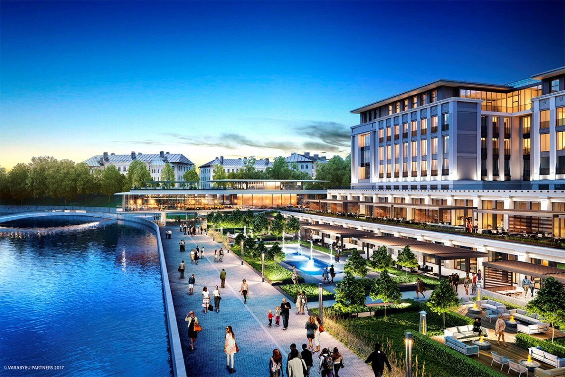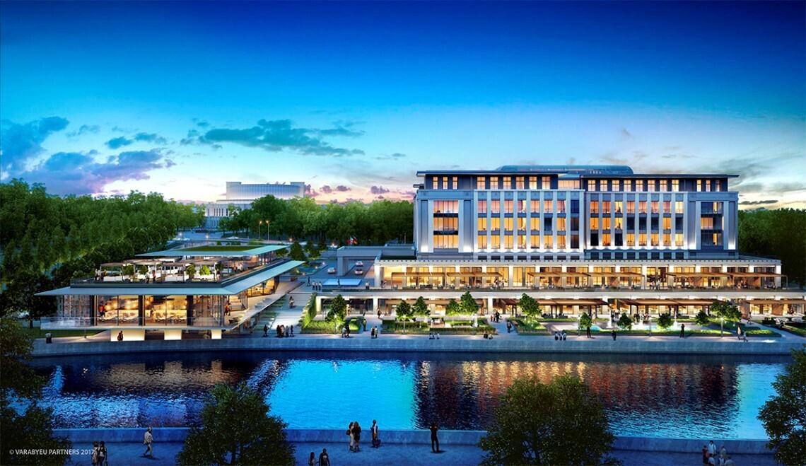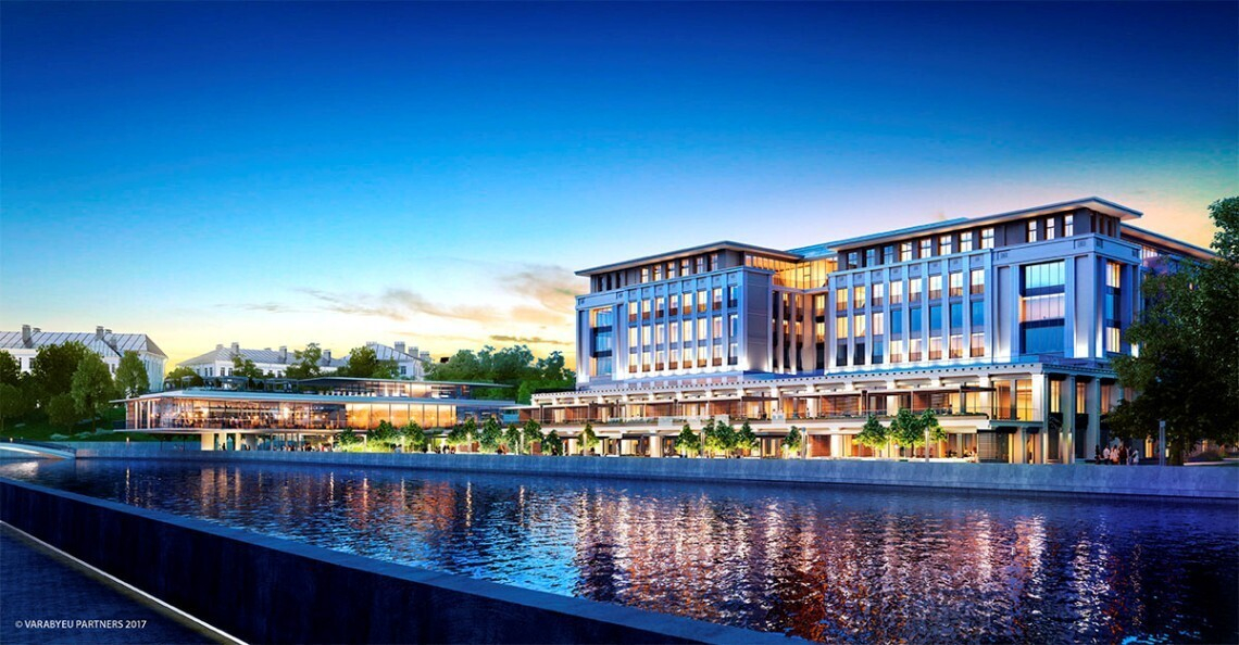 Сам комплекс условно можно разделить на две части. Первая — новые сооружения на месте идущего под снос «БелЭкспо», среди которых появятся пятизвездочный отель сети Viceroy и различные общественные объекты: торговый комплекс, казино, спа-комплекс с бассейном, кафе и другие. Гостиничные номера расположатся на 3−7 этажах сооружения. На верхнем этаже будут люксовые номера и скай-бар. «Архитектурная концепция гостиницы построена по принципу центрального многосветного атриумного пространства с верхним боковым светом, освещающим зимний сад на первом этаже», — рассказывают проектировщики. Рядом с гостиницей расположится ресторан, нависающий над рекой. Возможно, даже пол этого заведения будет прозрачным.