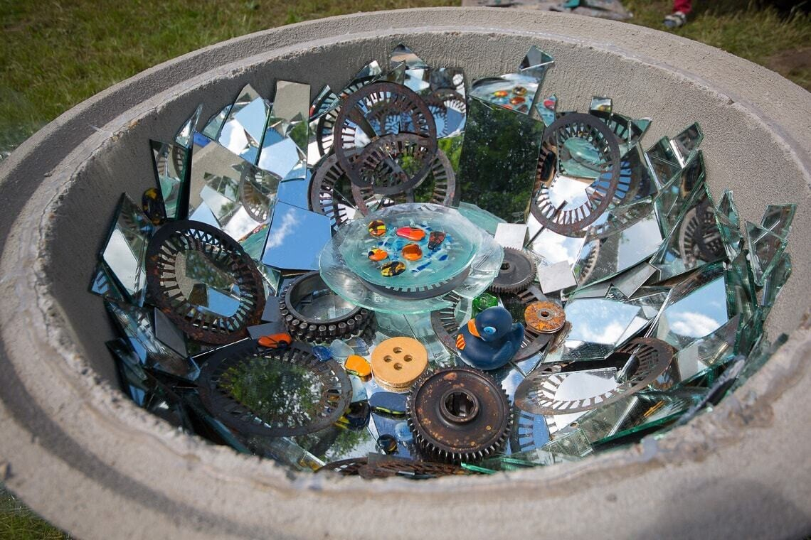 Среди объектов — внушительная расколотая монета времен Всеслава Чародея (тут можно переосмыслить «Битву на Немиге» и пройтись между борющимися сторонами), образ планеты, которую образуют сплетенные мужская и женская фигуры, «локатор» из лозы, «городские секретики» (три бетонных кольца-колодца с «тайной»: разными предметами городской среды под стеклом на зеркальном дне), гигантские «Очки», многометровые цветы из пластика и многое другое. А авторский коллектив из Германии Tape That впервые приехал в Минск, чтобы создать трехметровый прозрачный «Экран».