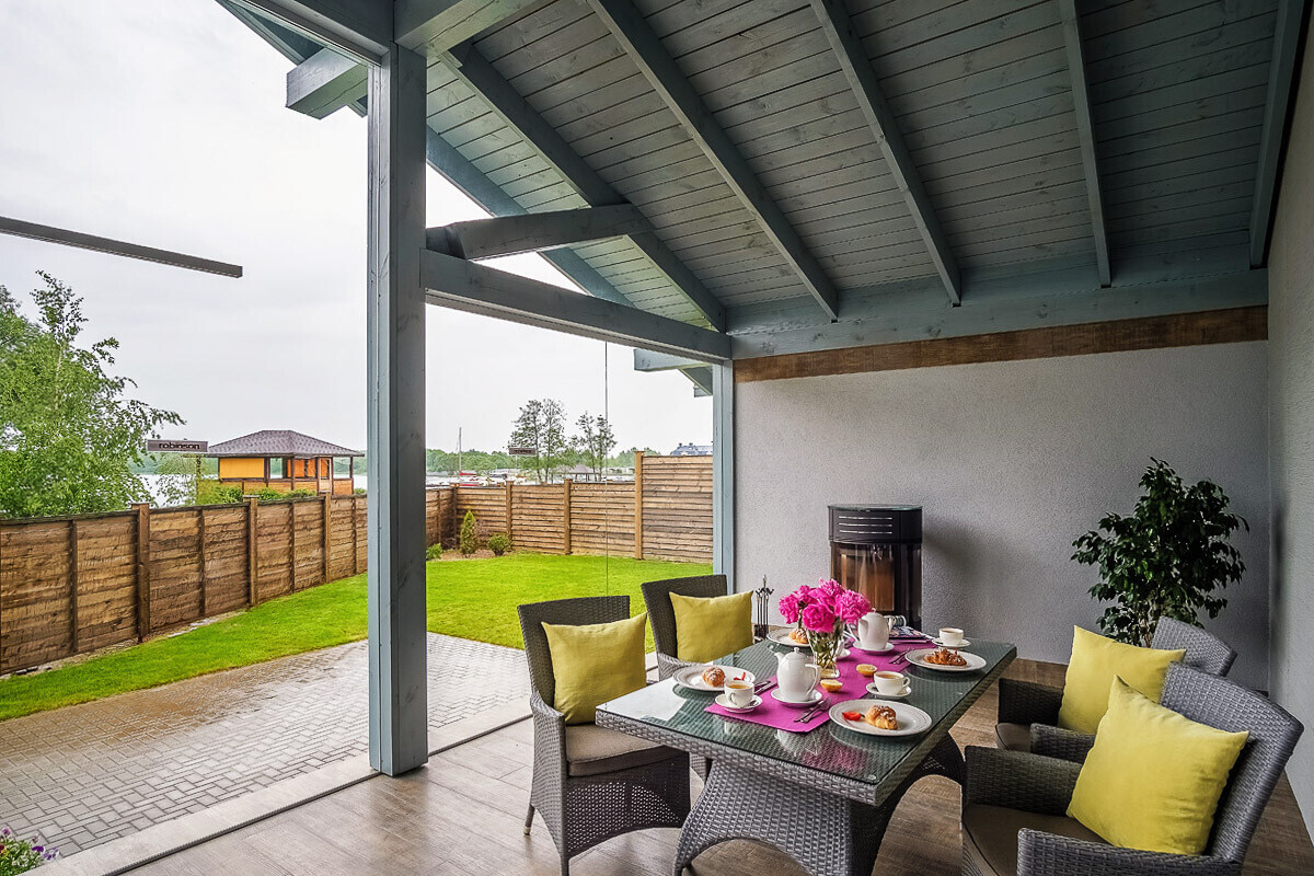 Две виллы полностью изолированы друг от друга, террасы и внутренние дворики не соприкасаются, а поэтому для проведения мероприятий в каждой из них в одно и то же время не будет никаких помех. А если появится необходимость объединить два помещения, между виллами откроются коридор и забор.