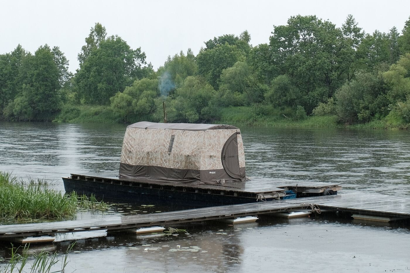Отдельно стоит отметить походную баню, которую устанавливают на плоту. Пол шатра выстилается свежескошенной травой, а прямо из парилки можно прыгать в реку.